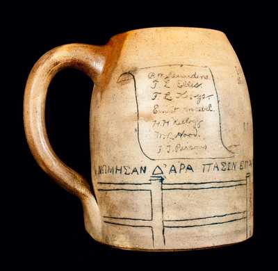 Exceptional Presentation Stoneware Yale Mug with Elaborate Incised and Cobalt-Highlighted Decoration, Incised "F.T. Persons '94 / 60 South Middle / Yale / Apr. 9. 1894," cylindrical mug with rounded shoulder and applied handle, decorated with an incised and cobalt-highlighted Yale Fence flanking an incised Yale Shield, which reads "YALE '94." Incised and cobalt-highlighted Greek slogan above translates to "Reinvigorated with all their glasses filled, they once again sang out." Midsection features the incised and cobalt-highlighted German poem, which translates to "I am a little stein / Not ever do I hold wine / Just always beer / So come now here / And drink out of this stein." One side of mug features an incised and cobalt-highlighted scroll, which lists the following names "P.W. Saunders, T.L. Ellis, F.L. Keays, Ernest Knaebel, H.H. Kellogg, W.D. Hood, and F.T. Persons." Opposite side decorated with an incised and cobalt-highlighted cartouche, which reads "B.U. / CHC / N.H.T." Handle incised with the cobalt-highlighted inscription "OLD SOUTH MIDDLE 1750". Underside incised "F.T. Persons '94. / 60 South Middle / Yale / Apr. 9. 1894." (This name is also listed within the scroll on the side of the mug.) A particularly fine example. Mint condition. H 6 1/4".