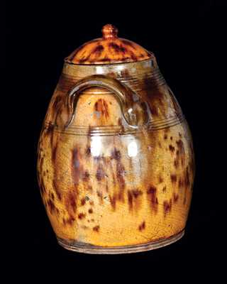 Rare Glazed Redware Commemorative Jar with Lid, Dated 1788, probably Philadelphia, PA origin, early 19th century, ovoid jar with ribbed strap handles, heavily tooled shoulder and base, and including its original domed lid. Jar decorated with daubs of manganese over a mottled green, orange, and yellowish ground. Original lid with similar glazing over an orange ground. Underside of jar and lid featuring incised date "1788," likely commemorating an important date and not referring to the jar's date of manufacture. Excellent form and color. A similar commemorative jar, dated on the underside "1715," but made during the first half of the 19th century, is currently in the collection of the Philadelphia Museum of Art, pictured in Garvan's "The Pennsyvania-German Collection," p. 228, figure 21. Overall very nice condition. Wear to rim. Chips to edge of lid. Some chipping to base, mostly shallow and small. Wear to edge of one handle. H (including lid) 10 1/2".