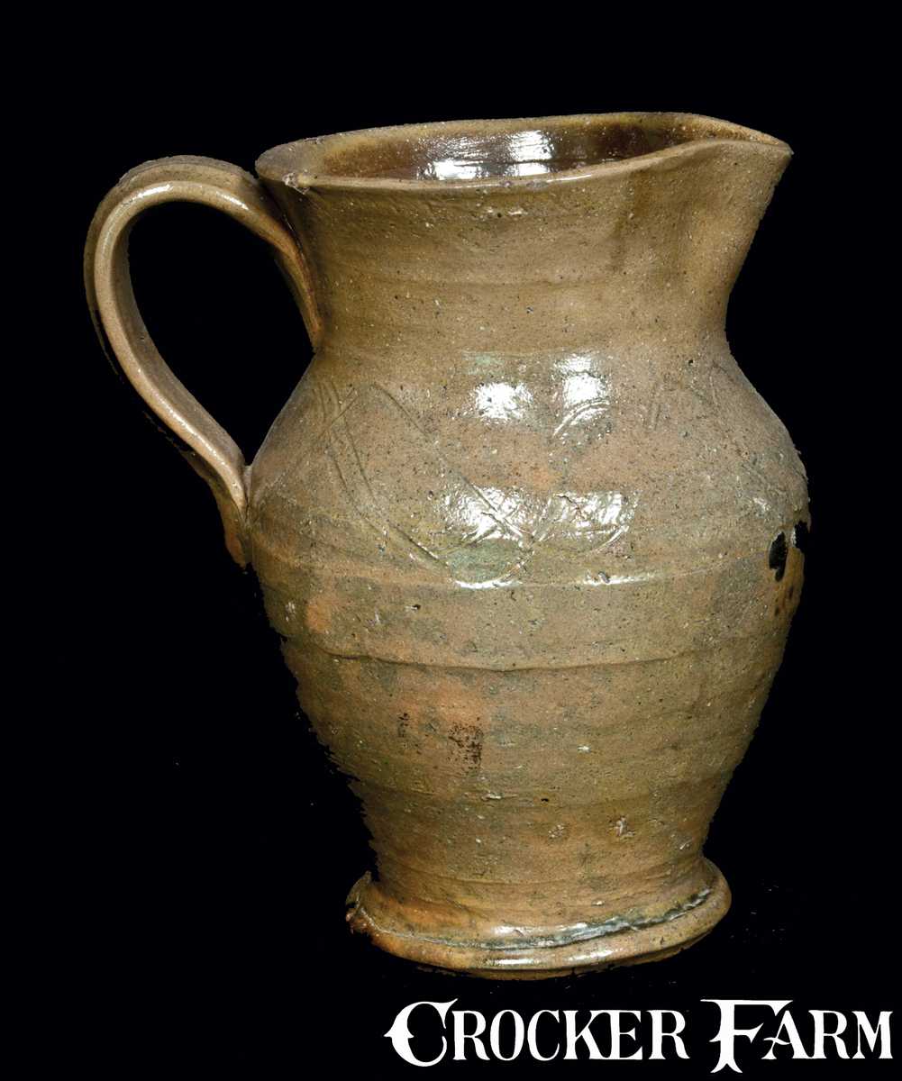Unusual Footed Stoneware Pitcher with Incised Lines, North Carolina Origin