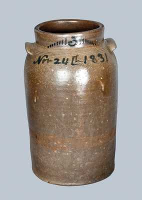 Extremely Rare and Important Early Shenandoah Valley Stoneware Churn, Dated in Cobalt Script "Nov the 21st 1831," attributed to Andrew Coffman at the John Zigler Pottery, Timberville, VA, 1831, cylindrical form with heavily-tooled shoulder, tall collar, and applied tab handles, decorated on one side with a two-stemmed brushed and slip-trailed floral design. Rim with slip-trailed design consisting of a circle or stylized flower head flanked by graduated vertical slashes. Reverse featuring the slip-trailed cobalt date "Nov the 21st 1831," along with the number 3 flanked by vertical slashes above. Color and aspects of the floral decoration are consistent with early Rockingham County, Virginia, stoneware produced by Andrew Coffman at the shop of John Zigler in Timberville. Of significant note is the fact that this churn bears the earliest date we have seen on a piece of Shenandoah Valley stoneware. While variations of floral motif, which involves tulips blossoming from a stem with distinctive leaves, can be found on Timberville and later Rockingham County products, the unusual decorations at the rim are likely influenced by works of earlier potters from Alexandria or the Richmond area. The churn form, very rare in early Shenandoah Valley stoneware, is previously-undocumented among the products of Zigler's shop. Provenance: Recently discovered in West Virginia. Top-to-bottom crack to left of one handle, continuing onto underside. Additional 9" crack from rim to right of same handle. Traces of rust from iron bands on surface. H 14 1/2".