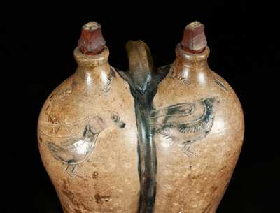 Very Rare Stoneware Gemel with Incised Bird Decorations, Stamped Twice "NEW-HAVEN," Absalom Stedman or Stedman & Seymour, New Haven, Connecticut, circa 1830, conjoined ovoid jugs, each decorated with a folky incised and cobalt-highlighted design of a bird with ringed-neck and impressed circular eye. Brushed cobalt band between jugs. One jug incised "R," while other is incised "W," possibly to denote "Rum" and "Whiskey". Impressed on each jug with the cobalt-highlighted stamp "NEW-HAVEN," used by Absalom Stedman and Frederick Seymour in New Haven, CT, circa 1830. A highly-prized stoneware form with superb decoration. Provenance: A fresh-to-the-market example from a forty-year Pennsylvania collection. Restored handle, including added blue to the handle terminals. Some restoration to spout area. In-the-firing line at base where jugs are joined. H 9 5/8".