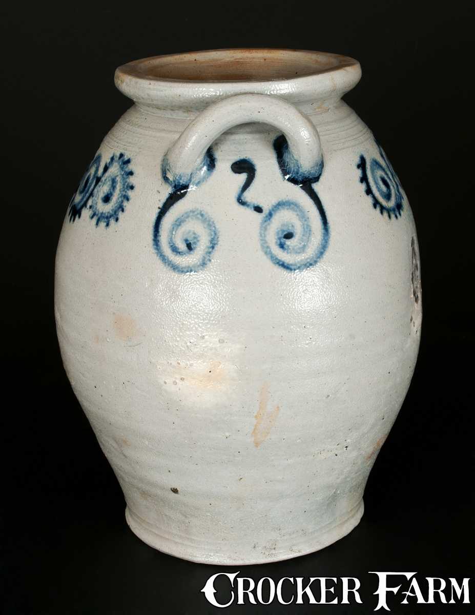 Exceedingly Rare Two-Gallon Stoneware Jar with Cobalt Watchspring Decoration, attributed to Abraham Mead, Greenwich, CT, circa 1790, ovoid jar with footed base, heavily-tooled shoulder, and flared rim, the shoulders with applied open loop handles. Decorated on the front and back with a boldly slip-trailed vine featuring four coiled "watchsprings" and small leafy accents. Additional watchspring motifs descend from each handle terminal, flanking a slip-trailed number "2". A particularly fine example with wonderful decoration and exceptional color, featuring dark trails of cobalt against an evenly-fired, light clay ground. Few pieces by this important early Connecticut maker ever come to market, and eighteenth-century American stoneware objects of this decorative quality are considered very rare. This rarity is compounded by the jar's extraordinary condition. Provenance: Previously descended directly in the Mead family. Excellent, as-made condition with a contact mark on each side, an in-the-firing separation on underside, and some minor in-the-firing separations where handle terminals meet shoulder of jar.