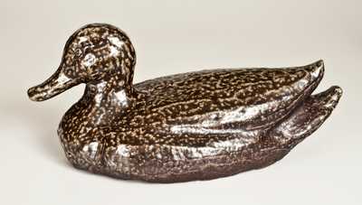 Rare and Fine Sewertile Duck Doorstop, Signed "WAGONER," American Sewer Tile Pipe Company, Midwestern U.S. origin, early 20th century, figure of a duck with raised wing and tail tips, the head nicely-executed with rounded cheeks and ball-shaped eyes. Underside incised "WAGONER". This doorstop is attributed to one of the Wagoners associated with the Brazil, Indiana plant of the American Sewer Pipe Company, which had factories in several states and whose workers often competed in contests between themselves in producing sewer tile folk art. This company was started as the Monarch Sewer Pipe Company in 1884 and when sold to American Sewer Pipe Company grew to thirty kilns. At its apex, it was the largest sewer pipe manufacturer in the state. Provenance: Jack and Susan Batdorff Collection; purchased from Ned Pennington in 2006. As-made condition with an in-the-firing separation along bottom and a 2 1/2" in-the-firing separation extending up from base on side of duck. L 13 1/2".
