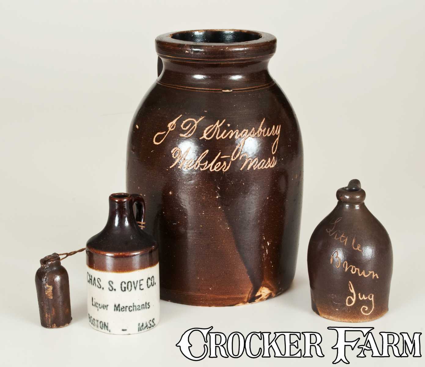 Lot of Three: Webster, MA Stoneware Oyster Jar w/ "Little Brown Jug" and Boston, MA Stoneware Salesman's Sample Jug