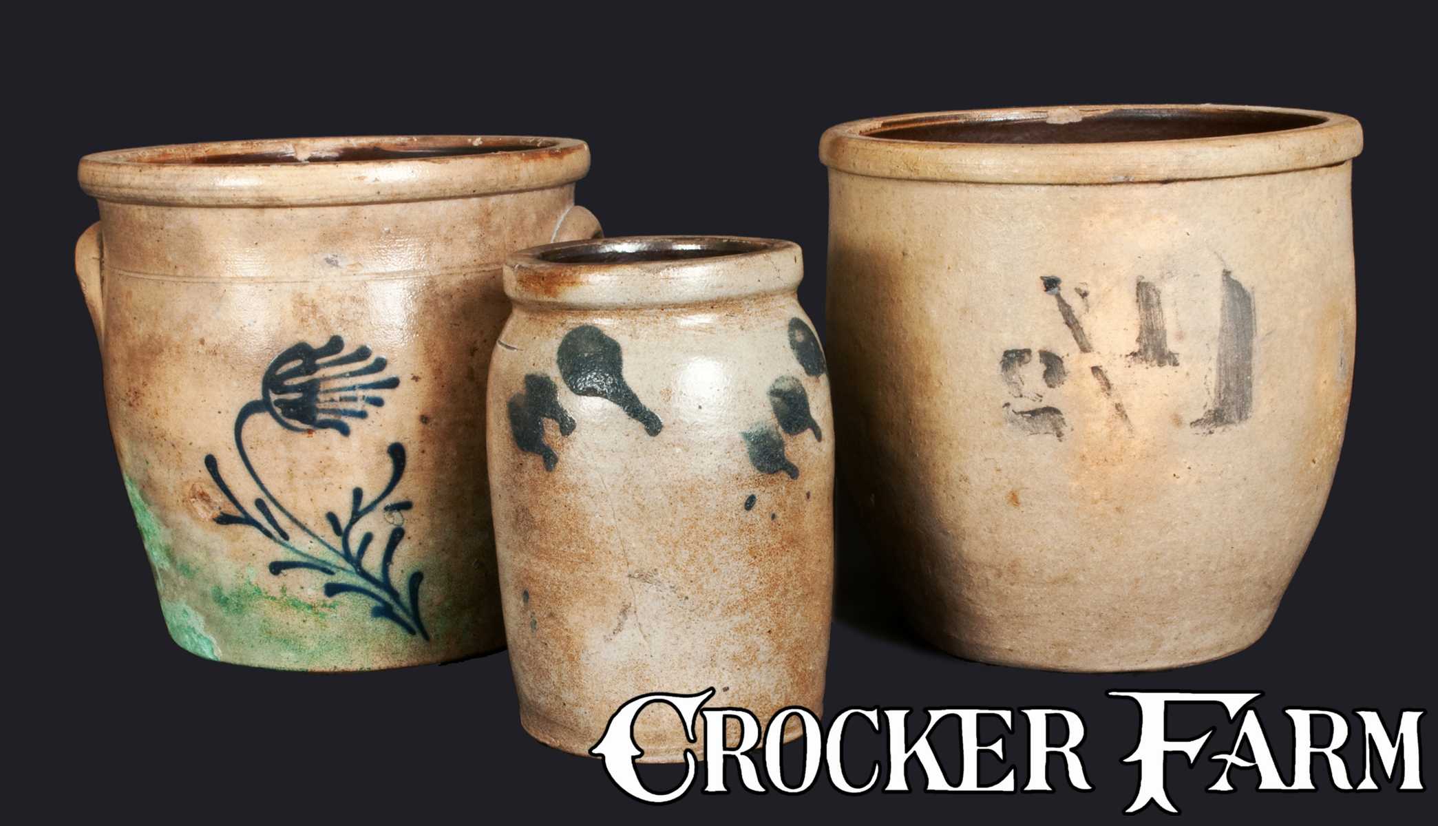 Lot of Three: Stoneware Jars incl. Quart-Sized PA Jar, Slip-Trailed NY Floral Cream Jar, and 1 1/2 Gal. Cream Jar