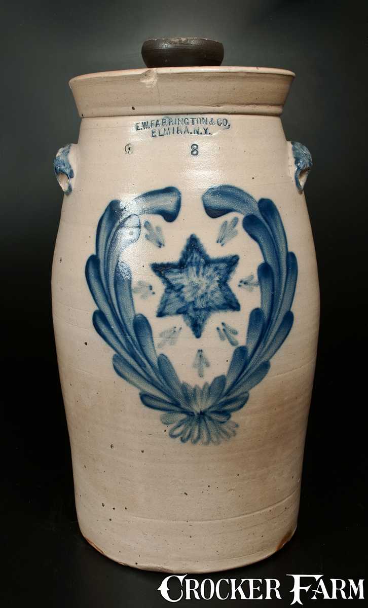Rare 8 Gal. E.W. FARRINGTON / ELMIRA, NY Stoneware Churn w/ Star and Unusual Molded Handles
