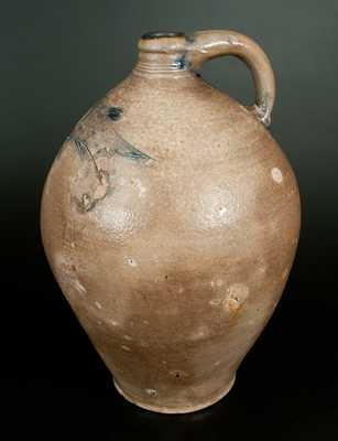 Extremely Rare Large-Sized Ovoid Stoneware Jug with Incised Fish Design, Manhattan, NY origin, probably Crolius family, circa 1800, approximately four-gallon ovoid jug with heavily-tooled neck and semi-rounded spout, decorated with a large, deeply-incised design of a fish with heavily-detailed fins and circular eye. The fish design was embellished with cobalt in a deliberate manner, with heavy highlights to the face and fins, no application to the eye, and spotted and dappled application to the body. Heavy rounded handle on reverse with impressed lower terminal and cobalt highlights. The distinctive form and color of jug indicate a Manhattan, NY origin. Incisd fish decorations are exceedingly rare among New York City stoneware products, with only a few examples known. In addition, this jug, measuring approximately four gallons, is one of the largest examples of the form we have seen with a Manhattan origin. Its imposing, large-sized fish design measures an impressive 7 1/2" long. Provenance: A fresh-to-the-market example, deaccessioned from a museum. The jug was donated to the museum in 1974, having been purchased by the donor in the 1930's from a prominent Connecticut antiques dealer. March's auction will be the first time this piece will be sold on the public market in eighty years. Contact mark to shoulder and side near base. Base chip. Smooth chip to spout, which appears to be in-the-firing. H 16 1/2".