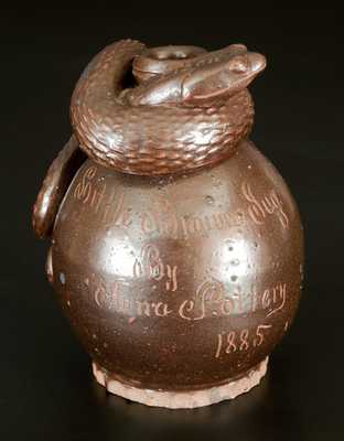 Exceptional Anna Pottery Stoneware Snake Jug, Incised "Little Brown Jug / by / Anna Pottery / 1885," Wallace and Cornwall Kirkpatrick, Anna, IL