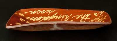 Exceedingly Rare and Important Slip-Decorated Redware Loaf Dish with Elaborate Biblical Inscription, Norwalk, CT origin, mid 19th century, with coggled edge, draped-molded platter of rectangular form with rounded edges, the interior profusely decorated with the slip-trailed script inscription "Blessed are the Poor in spi/ rit for thars is the kingdom of / heven". These words are the first of eight Beatitudes spoken by Jesus during the Sermon on the Mount in Matthew Chapter 5 of the Bible's New Testament. In our research, we can find no other example of Norwalk redware with a longer slip inscription. The distinctive handwriting style with pointed "t's" and other specific characteristics reveal that it was probably decorated by master calligrapher, Henry Chichester, who was responsible for the majority of the finer Norwalk inscriptions known. This recently-discovered example is an important addition to the large body of slip-inscribed work known from Norwalk, CT, and is possibly the most profusely-decorated example known from this popular school of early dishware. Provenance: Recently found in Kentucky, this loaf dish was purchased by the consignor's wife in the 1930s or 1940s. Literature: For more information on Norwalk, CT redware and the decorator, Henry Chichester, see Andrew and Kate Winton, Norwalk Potteries, Phoenix Publishing, Canaan, CT, 1981. Glazed interior surface and slip survive in strong condition with some light wear to edges of slip. 1" chip to bottom edge, primarily visible on reverse. A few other minor chips to corners, visible on reverse. L 13 1/4" ; W 10 1/2".