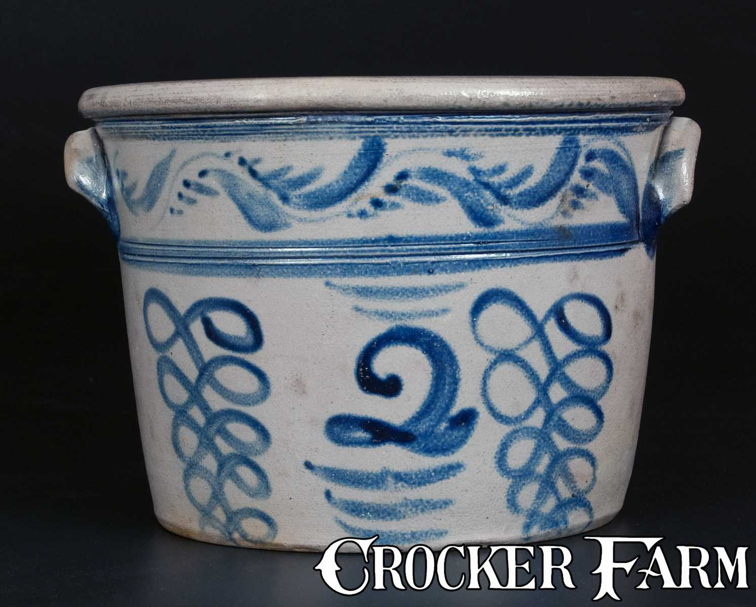 Extremely Rare Two-Gallon Stoneware Bowl with Profuse Freehand Cobalt Decoration, Stamped "BOUGHNER / GREENSBORO, PA," circa 1855, tapered bowl with semi-rounded rim, applied lug handles, and heavily-tooled shoulder, the front lavishly-decorated with freehand stripes and vining, and a large script "2" with dashes above, and highly unusual looping lines to the left and right. Heavy cobalt circles around handle terminals. Reverse impressed with the scarce and highly desirable maker's mark, "BOUGHNER / GREENSBORO / PA" above a two-gallon capacity mark. In this variation of the maker's mark, the "A & W", representing brothers, Alexander Vance and Wiliam, have been removed, indicating some change in ownership of the operation. To our knowledge, this is the only Boughner bowl we can find record of. The looping line decoration adds greatly to the piece's decorative appeal and rarity. Provenance: A fresh-to-the-market example from a forty-year Southern U.S. collection. Professional restoration to base on side of bowl, extending a short distance onto underside. Minor chips to handles. H 8 1/4" ; Diameter 11 1/4".