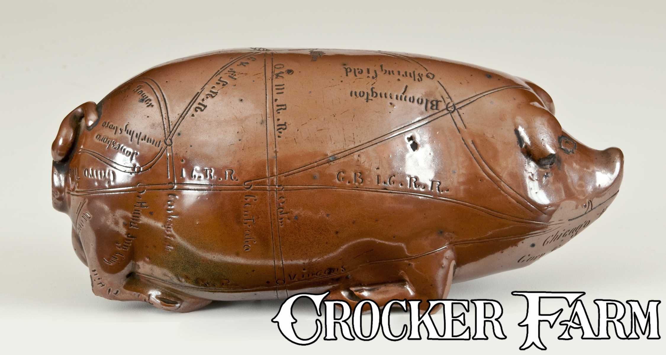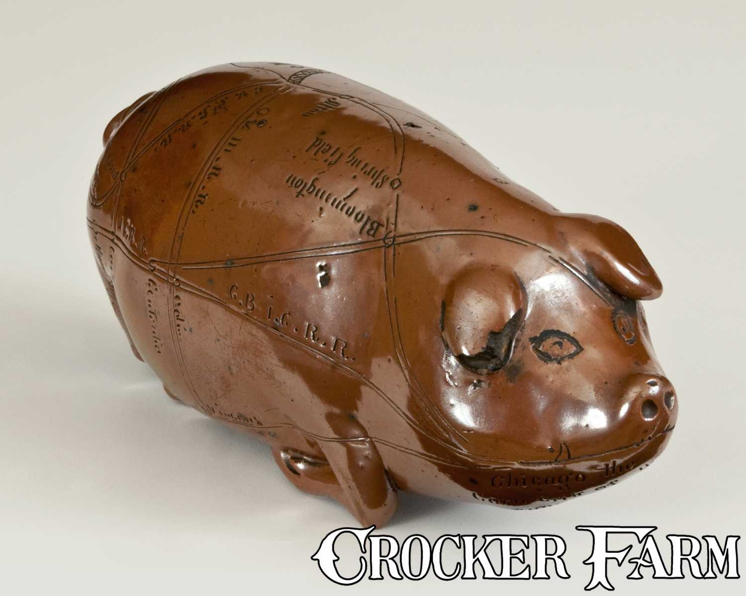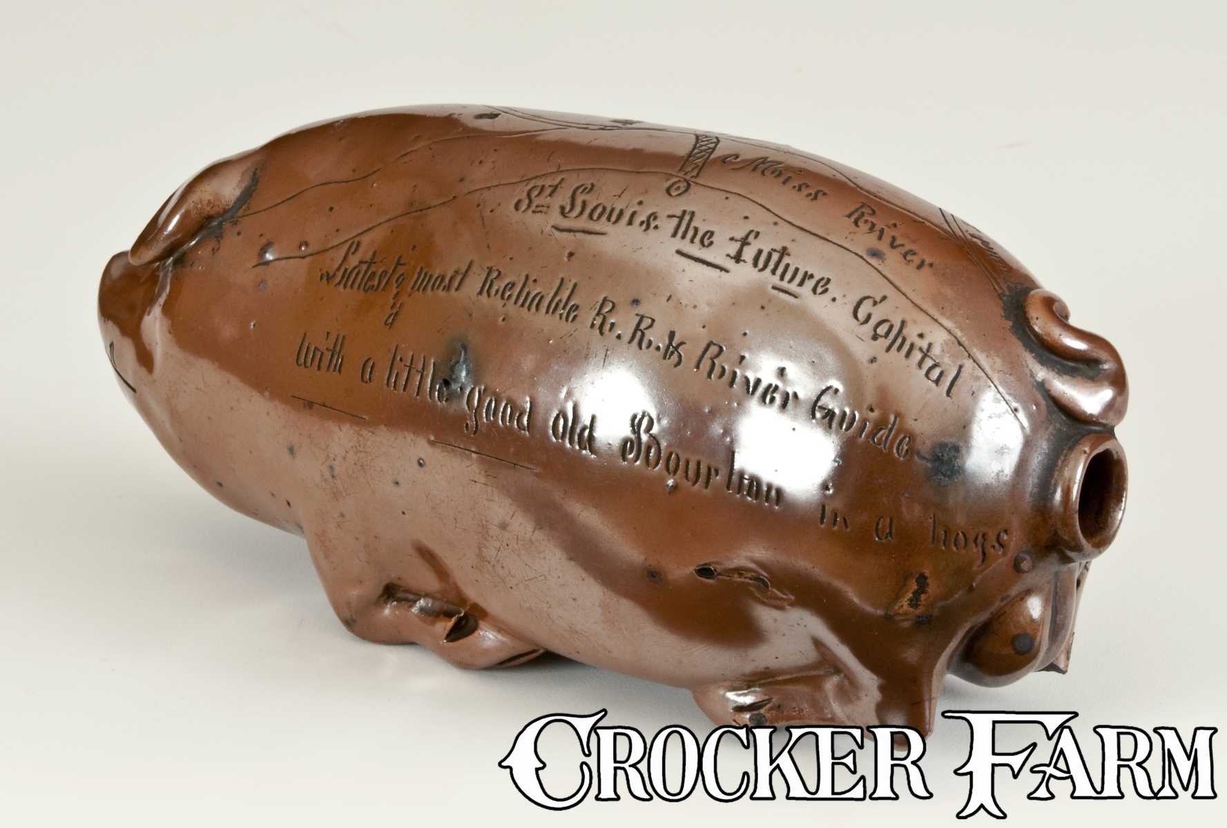 Fine Anna Pottery Stoneware Pig Flask with Incised Railroad Map, Wallace and Cornwall Kirkpatrick, Anna, IL, circa 1885, Albany-slip-glazed flask in the form of a pig with hole at rear, anatomically correct underside, and incised details to hooves and face, including the unusual addition of teeth to the mouth. Inscribed on one side "Latest and most Reliable R.R. & River Guide / with a little good old Bourbon in a hogs". Remainder of pig incised with a railroad map of the Midwest, including the following landmarks: St. Louis the future Capital, Miss River, Grand Tower, Murphysboro, Jonesboro, C & St L.R.R., O & M.R.R., Alton, Springfield, Bloomington, iC.R.R., C.B i.C.R.R., Carbondale, Centralia, Odin, Vincens, Mounds, Tunnel Hill, Cairo The, Anna Jug City, Cincinnati the ancient Porkopolis, and Chicago the Corn Crib of the World. A crisply-incised example with easily-readable inscriptions and landmarks. Provenance: A fresh-to-the-market example, consigned from New England. Loss to one ear. Chip to back of one rear leg, possibly in-the-firing. Otherwise excellent condition. L 7 3/4".
