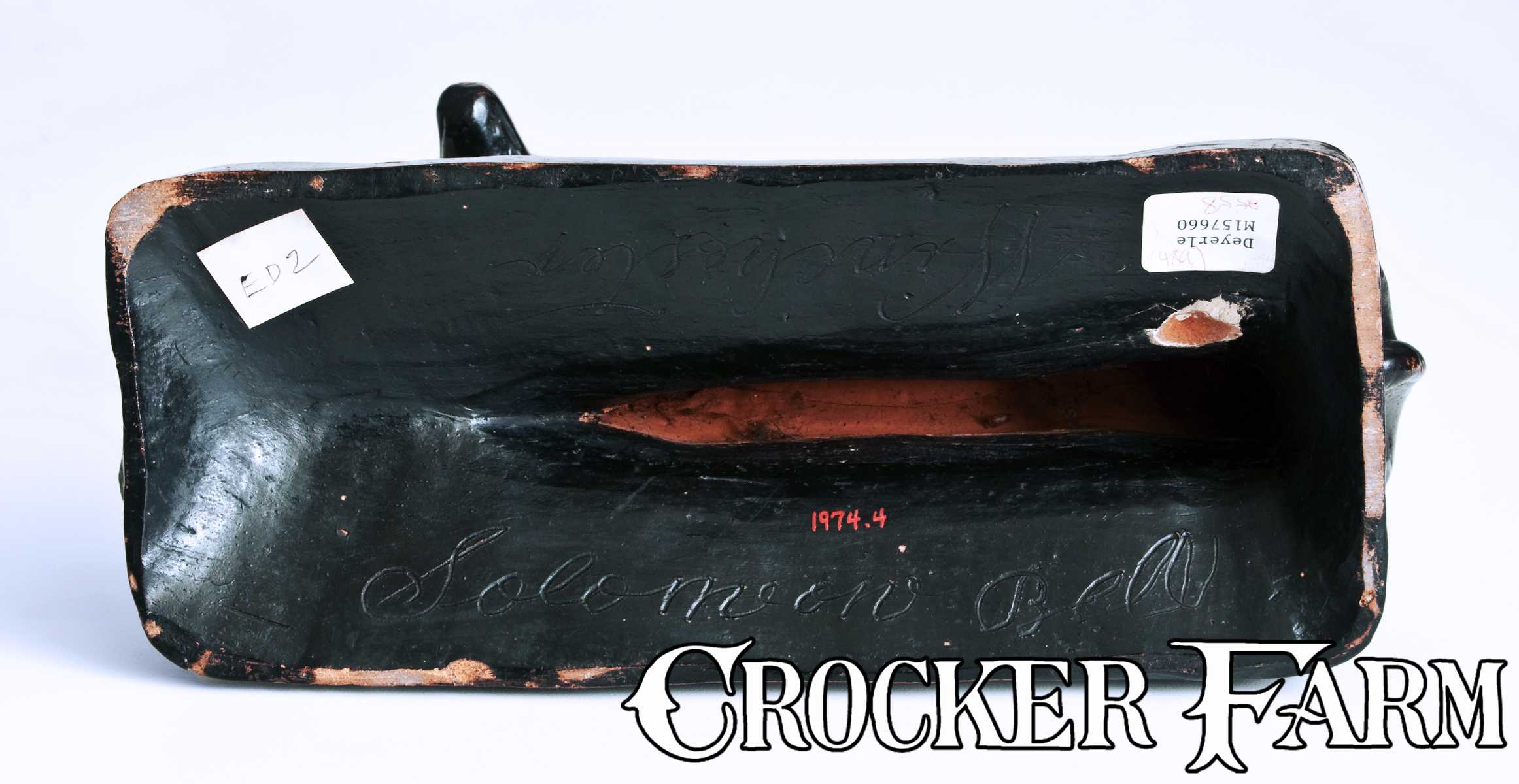 Very Rare and Important Shenandoah Valley Redware Figure of a Whippet, Signed in Script "Solomon Bell / Winchester," circa 1840, finely-molded figure of a reclining whippet atop an oblong base with incised border, the figure with incised details to muzzle and paws, the surface covered in strong black paint with traces of white to eyes. Base reveals a large number of fettling knife marks, indicating a good amount of hand craftmanship to the sculpture when it was removed from the mold. Underside incised in large script "Solomon Bell / Winchester". This iconic Shenandoah Valley form was produced by several members of the Bell family, most notably Samuel and Solomon in Winchester and Strasburg, VA and their brother, John, in Waynesboro, PA. Other than their hand-modeled lion figures, no other pottery form is considered more distinctly Bell, and few signed examples have survived to this day. An interesting aspect of this figure is that it was produced while Solomon was still quite young. Born in 1817 and seventeen years younger than his potter brother, John, Solomon Bell created this object while still in his early to mid twenties. At this time, he was still working at the shop of his father, Peter, in Winchester. In 1845, Solomon would move to join his brother, Samuel, in Strasburg, where they would successfully run a pottery together for the next several decades. As business partners, Samuel would become primarily involved in marketing wares, while Solomon was relied on as the master potter of the operation. Among the vast surviving body of signed products by Solomon Bell known, his whippets rank among some of his finest and most highly-prized works. This particular whippet figure carries an outstanding provenance. It is believed to be the model for the gilt image of a Bell whippet on the cover of Alvin H. Rice and John Baer Stoudt's 1929 book, The Shenandoah Pottery, a ground-breaking study and catalog of ceramics from the region. This figure was later owned by collector and author, William E. Wiltshire III, who featured it on page 35 of his book. It has been reported that Wiltshire purchased a several-thousand-piece Shenandoah Valley pottery collection to acquire this one whippet, his favorite out of the entire group. The figure subsequently sold in an important sale of Wiltshire's collection in 1978 at Sotheby-Parke Bernet in New York, and was later owned by the prominent Shenandoah Valley decorative arts collector, Henry P. Deyerle, whose collection was sold at Sotheby's in 1995. Our July 19 auction will mark the first time a signed Solomon Bell whippet has come to auction since this example sold at the Deyerle sale in 1995. This famous folk art sculpture bears the distinction of being one of the finest works by Solomon Bell ever to cross the auction block. Provenance: Ex-William Wiltshire III; Sotheby Parke-Bernet Galleries, April 1, 1978; Ex-Henry P. Deyerle; Sotheby's Sale 6716, Important Americana: The Collection of Dr. & Mrs. Henry P. Deyerle, May 26 and 27, 1995; Private Collection. Essentially as-made condition with some in-the-firing lime or stone pings, and a minor chip to edge of base on underside. L 10 1/4".