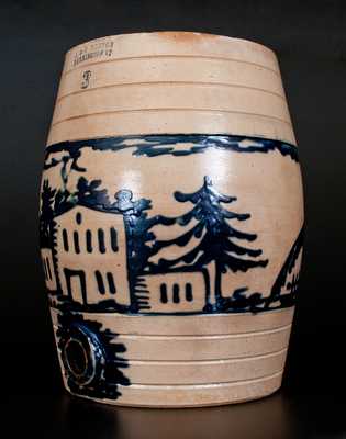 Exceptional Three-Gallon Stoneware Water Cooler with House, Deer, and Pheasant Decorations, Stamped "J. & E. NORTON / BENNINGTON, VT.," circa 1855, semi-ovoid cooler with tooled banding and applied circular bunghole, profusely decorated around the body with a pastoral scene in the round of a Federal mansion flanked by ells and surrounded by a forested background, three pine trees, a reclining stag with spots, a pheasant perched on a stump, and three fences. The addition of a slip-trailed sky above the scene adds to the artistry and rarity of this example. Elaborate slip-trailed highlights surrounding the bunghole. Cobalt highlights to maker's mark and capacity mark at shoulder.