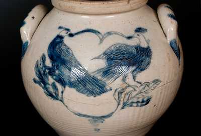 Outstanding Five-Gallon Stoneware Jar with Large-Sized Incised Decoration of an Owl and Two Birds with a Banner, attributed to Brayton & Kellogg, Utica, NY, circa 1827-1833, rotund jar with applied lug handles and semi-squared rim, decorated with a large incised design of an owl with heavily-feathered body and impressed eyes, perched on a leafy branch. Additional foliate design to the bird's left. Reverse decorated with a large incised design of two crested birds perched on a branch holding a banner in their beaks. Elaborate cobalt decoration throughout. Handles decorated with cobalt stripes, the terminals additionally accented with cobalt and incised lines resembling leaves or flower buds. This significant jar reveals the hand of a skilled incised-work decorator. The form, size, and bird-with-banner motif, relate to an example in the Weitsman Stoneware Collection at the New York State Museum bearing the mark "BRAYTON & KELLOGG" of Utica, NY. A monumental cooler with profuse incised bird decoration, bearing the mark "J. HUMISTON" of South Amboy, NJ, may also share the same decorator. Outstanding in form, size, and decoration, this jar features two masterfully-executed avian designs, and is a striking example of ceramic folk art when viewed from the front or reverse. The bird-with-banner design measures approximately 10" high x 7 3/4" wide, while the owl-in-branch decoration stands over 10" tall. Jar was broken into three pieces and reglued, including a 1" wedge missing along crack near base, with a tiny hole visible through interior. A small base chip and tiny rim nick. H 14 1/2".