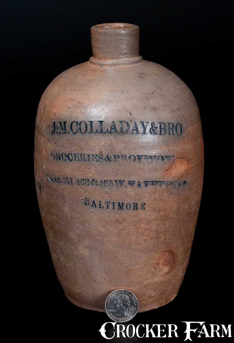Unusual 1/4 Gal. Baltimore Stoneware Jug with Impressed Four-Line Advertising