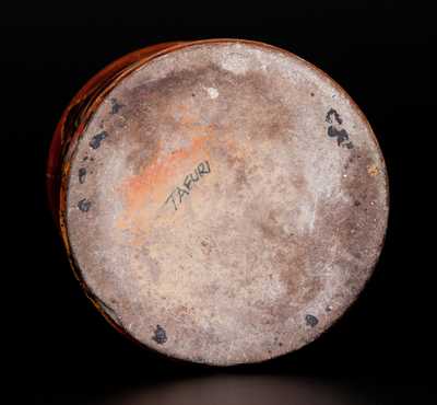 Exceedingly Rare and Important Southern Redware Mug with Profuse Three-Color Slip Decoration, Alamance County, NC origin, probably Jacob Albright, Jr. and Henry Loy, late 18th or early 19th century, large-sized cylindrical mug with footed base and tooled rim, the surface covered in a reddish slip wash and decorated in cream, green, and brown slip with two tulip plants embellished with spots. These floral designs are flanked to the left and right by vertical stripes of cream-and-brown slip with cream-spotted borders. The lower handle terminal is decorated with a cream-and-brown slip daisy blossom. The mug's exterior and distinctive yellow-clay interior are covered in a clear lead glaze. This recently-discovered example is one of a very few Alamance County, North Carolina, redware mugs from this early period known. The artistic application of the decoration and use of four colored slips (reddish iron-based engobe with trailed copper, manganese, and kaolin slips) indicate the sophistication of a Southern potting school which has only recently been uncovered. The majority of known examples of Alamance County, NC slipware are held in museum collections, most prominently Old Salem Museum and Gardens in Winston-Salem, NC. Others can be found at the Colonial Williamsburg Foundation in Williamsburg, VA, the Henry Ford Museum in Dearborn, MI, and the Barnes Foundation in Philadelphia, PA. Provenance: A fresh-to-the-market example, from a forty-year Pennsylvania collection. Missing handle. Top-to-bottom crack with some thin flakes along crack at shoulder. A few small shallow rim chips. A tight, faint hairline from rim, measuring a few inches long. Small chips and wear to base. Glazed surface retains brilliant luster and survives in strong condition with typical wear, primarily to cream slip spots. H 6" ; Diameter (at base) 4 1/8".