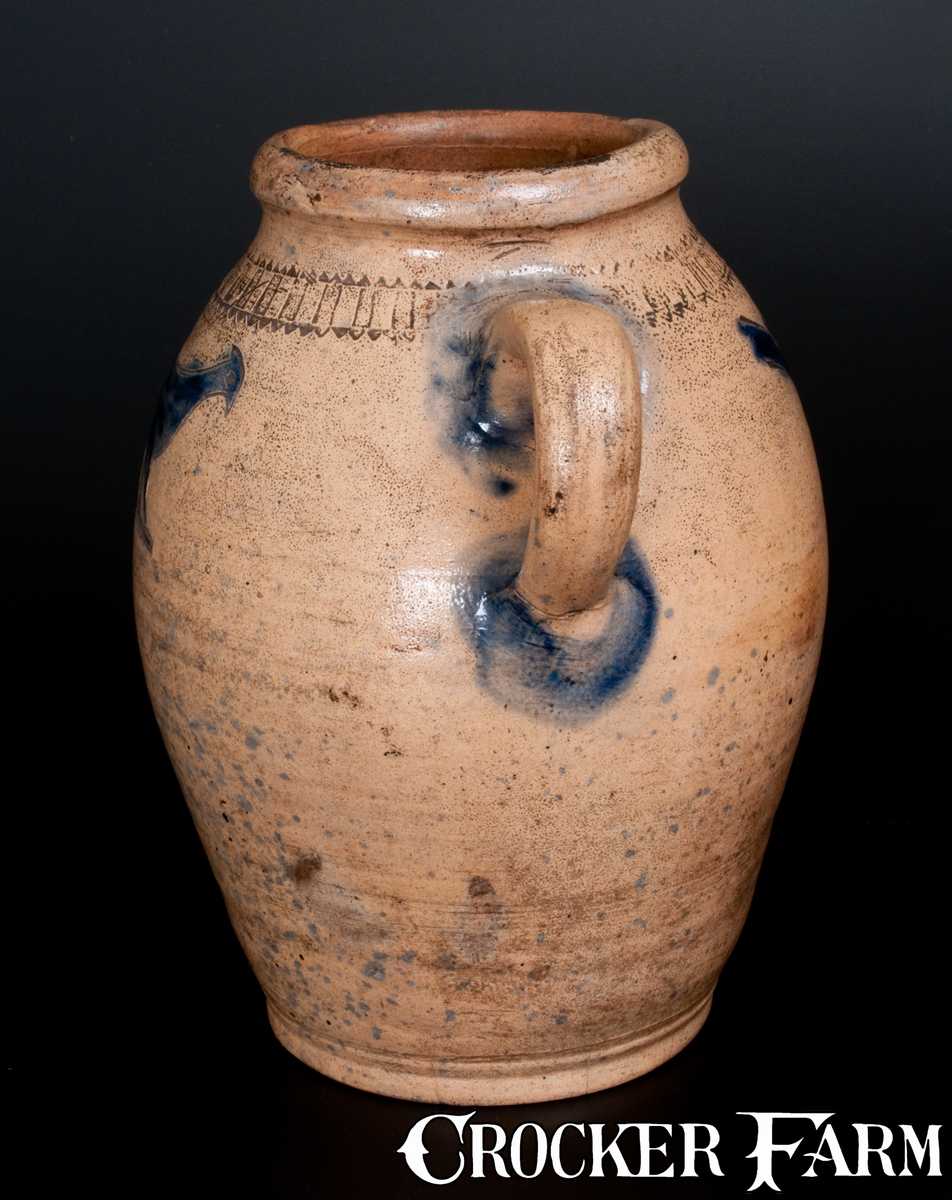 Exceedingly Rare and Important Cobalt-Decorated Stoneware Teapot with Impressed Bird and Coggled Design, attributed to Thomas Warne and Joshua Letts, South Amboy, NJ, early 19th century, approximately one-half-gallon, ovoid vessel with applied tubular pouring spout with tapered tip, strap handle, rounded rim, and footed base. Each side decorated with an impressed and cobalt-highlighted design of a crested bird with long tail. Shoulder embellished with a coggled column and triangle design. Brushed cobalt highlights to base of spout and handle. This recently-discovered example is one of a small number of salt-glazed stoneware teapots from the 18th and early 19th century known. The teapot form, almost strictly produced during America's colonial and early Federal periods, is considered one of the rarest and most coveted of all of this country's stoneware forms. This form receives considerable attention in the 2009 book, Salt-Glazed Stoneware in Early America, written by Janine E. Skerry and Suzanne Findlen Hood, in which a few examples are illustrated as close links in design to their German ancestors. Only a small number of this form have survived, nearly all of which are attributed to Manhattan, NY. A testament to the early origin of this form is one diminutive example, inscribed "Elizabeth States her Pot," believed to have been made circa 1745 by Adam States, Sr., for his wife during a brief tenure in Manhattan. The teapot to be auctioned is the first example attributed to South Amboy, New Jersey, we have seen. The distinctive impressed bird design matches those found on signed jars produced by the firm of Thomas Warne and Joshua Letts in South Amboy, New Jersey, circa 1807. A significant new discovery in early American stoneware, and one of the finest examples of New Jersey stoneware to come to auction in years. Provenance: A fresh-to-the-market example, purchased by the consignor at an antiques show in Pennsylvania approximately forty years ago. Excellent condition with some crazing on the underside, which extends a short distance onto base, presumably in-the-firing, and a tiny base chip. H 8 1/2".