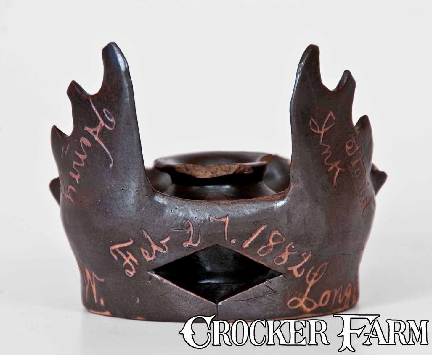 Very Rare Henry Wadsworth Longfellow Presentation Stoneware Inkwell, Signed and Dated "Compliments of L.A. Smith / Metropolis / March 4 1882," Illinois origin, 1882, wheel-thrown inkwell with central ink reservoir and exterior wall with highly unusual pierced-work geometric designs. Border of inkwell embellished with crimped edge and outstanding applied stag horn decoration. Surface covered in a dark-brown Albany slip and incised with the inscription "Compliments of L.A. Smith To / Henry W. Longfellow / Feb 27. 1882 / Ink Stand". Underside incised "Metropolis / March 4, 1882". This inkwell was made to commemorate the 75th birthday of the popular American poet, Henry Wadsworth Longfellow (1807-1882), an event which was widely-celebrated throughout the country. The inscription on the inkwell indicates that the vessel was actually made for Longfellow and intended to be given to him. One can think of few better gifts to present to a writer than an inkwell. Sadly, however, Longfellow would die just twenty days after this piece was made. It is presumed that the object never reached Longfellow's hands. The 1880 Federal Census lists the inkwell's maker as Louis A. Smith, born about 1861, and occupation as "Works in Pottery", in Metropolis, Massac, Illinois. The town of Metropolis is located just forty-two miles from Anna, Illinois. The whimsical nature of this piece and heavily-inscribed surface is reminiscent of Anna Pottery products, and there may have been some influence on Louis' work by the Kirkpatricks of Anna, Illinois. Outstanding folk art form with wonderful subject matter related to American literary and popular history. Two losses to rim of central ink reservour. Tiny chips and nicks to crimping of outer rim. H 3 1/4" ; Diameter (at base) 3 1/8".