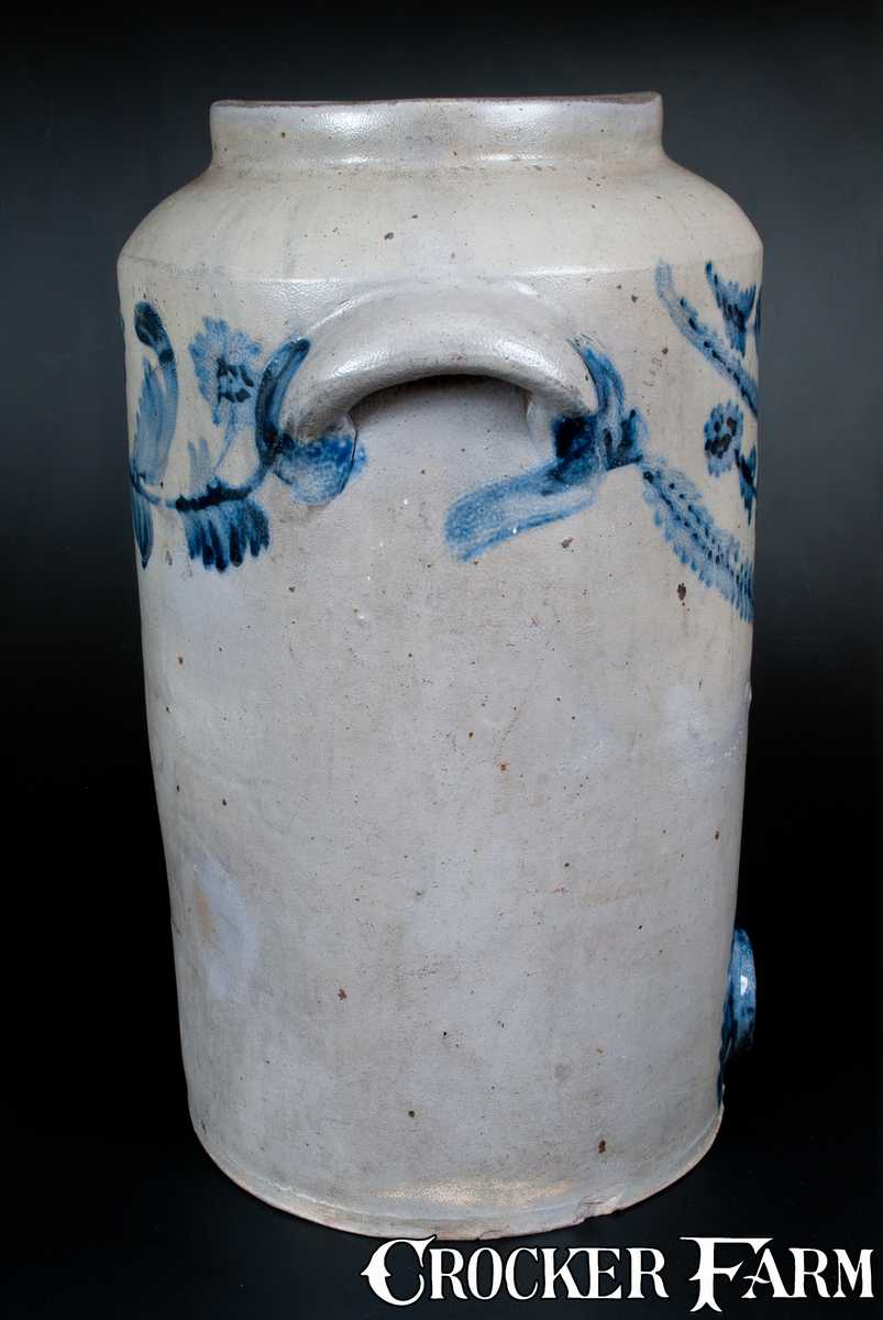 Very Rare Five-Gallon Stoneware Water Cooler with Elaborate Cobalt Floral Decoration and Original Air Hole, attributed to Henry H. Remmey, Philadelphia, PA, circa 1830, cylindrical cooler with rounded shoulder, thick pocket handles, and circular bunghole, the front decorated around the upper half with alternating garlands of daisies and swags, and further decorated below with a large daisy and an arching garland surrounding the heavily-decorated bunghole. Additional daisy garland decoration on reverse and cobalt highlights accenting the handle terminals. This recently-discovered cooler includes a highly-unusual original hole at the shoulder, presumably designed to allow air flow for easy pouring when the cooler held a lid. Provenance: A fresh-to-the-market example, found among the contents of a Baltimore County, MD farm. Approximately 10" tight line extending from right side of cooler's front through middle of right handle and onto right side of cooler. A few base chips. A few small bloated spots to clay body, which occurred in the firing. A minor in-the-firing chip to bottom edge of bunghole. H 18 1/2".