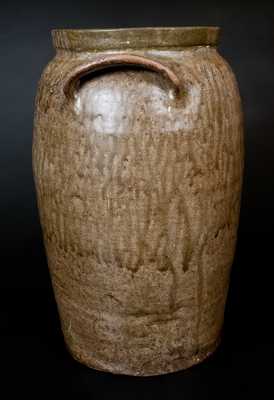 Exceedingly Rare and Important Three-Gallon Alkaline-Glazed Stoneware Churn, Incised "Lm Jan 27 1859 / Dave," Dave the Slave, Lewis Mile's Stoney Bluff Manufactory, Edgefield, SC, 1859, narrow, cylindrical form with rounded shoulder, squared rim, and large applied tab handles, the shoulder incised with the large inscription "Lm Jan 27 1859" underscored by the signature "Dave". Reverse with two incised slash marks on shoulder. Surface covered in a colorful, flowing alkaline glaze with olive-green coloration. This significant recent discovery is one of a very few known churns featuring the inscribed signature of enslaved African-American potter, Dave. Dave (ca. 1800-1875) bears the distinction of being one of America's most celebrated and studied African-American artisans. He was born into slavery about the year 1800, and it is believed he learned how to pot, as well as read and write, from an early master, Harvey Drake. Dave would be owned by several families and operate at different shops throughout his long life as a potter. He is most well-known for the incised writing on his pots, often in the form of poetic couplets. The ability to read and write was discouraged among slaves of the American South, and Dave�s words, carved boldly into the wares he produced, are considered a wonderful insight into the life and views of one enslaved man, as well as an assertion of his abilities as an artist. According to Goldberg and Witkowski�s groundbreaking article in Ceramics in America 2006, entitled Beneath his Magic Touch: The Dated Vessels of the African-American Slave Potter Dave, the potter generally dated a single piece each day. According to the authors' list of dated Dave pieces, this churn was made the same day as another dated jar, a highly unusual occurrence among his known body of work. Attesting to the rarity of this form, among the 169 signed and dated Dave pieces in Goldberg and Witkowski's article, no churn forms are mentioned. This auction offers an almost unique opportunity to acquire one of Dave's most elusive utilitarian forms. Provenance: A fresh-to-the-market example from a Southeastern Virginia collection, this churn was purchased by the consignor's mother several decades ago and has remained in the family's possession since that time. Professional restoration to entire rim. A hairline to far right side of jar's front, extending approximately 4" or 5" from rim. A second, very faint line from rim on front. Y-shaped line on underside, which forms a T at base, not apparently visible on interior. A 1 3/8" chip to underside of left handle. Minor base chips. H 16 1/4".