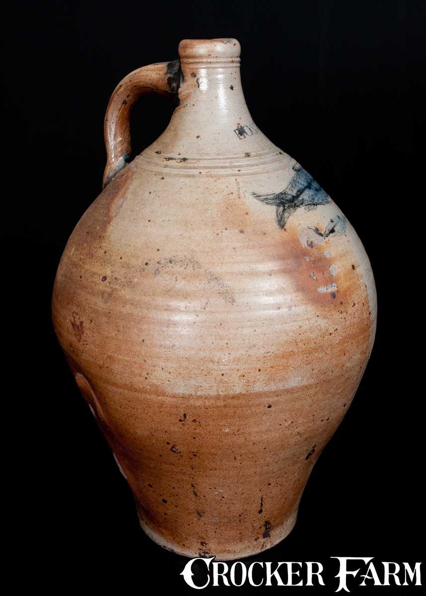 Exceptional Large-Sized Stoneware Jug with Impressed Double-Fish Decoration, Stamped "BOSTON," Jonathan Fenton, Boston, MA, late 18th century, approximately three-gallon, highly-ovoid jug with ribbed handle and tall, heavily-tooled neck, the front decorated with two impressed and cobalt-highlighted fish motifs, one of large size with heavily-scaled body, the other smaller with elongated mouth and small triangular fins. Impressed in large letters above, "BOSTON". Cobalt highlights to maker's mark and handle terminals. This example features Fenton's classic, early-style form with bulbous body and tall neck (arguably one of the most sculptural jug forms in all of American stoneware), and is larger than most Boston fish-decorated jugs known. The use of two fish designs on the same jug is highly unusual, and the fact that the decorator has showcased two different motifs adds to the jug's decorative appeal. One of the finest examples of Fenton stoneware we have ever offered. Excellent overall condition, with primarily in-the-firing flaws, typical of stoneware of this period and origin. A 1" in-the-firing chip to top of spout and a very minor in-the-firing chip to top of spout. Typical in-the-firing contact marks to surface, including one to left of smaller fish. A 1 3/4" shallow flake to underside at bottom edge of jug. Other small, shallow chips to underside at edge. H 17 3/4".