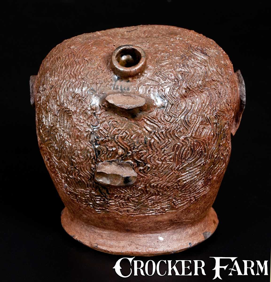 Outstanding Salt-Glazed Stoneware Face Harvest Jug with Albany Slip Decoration, probably Barrow County, GA, circa 1880-1900, wheel-thrown jug with flared base, sculpted in the form of a human head with applied spout to reverse. The face includes a well-executed chin and jaw line, applied ears, mouth, and nose, and modeled eyes within recessed sockets. Depressed areas at the figure's temples accentuate the cheek bones and impart a sense of realism to the sculpture. Heavily-combed incising forms the figure's hair, while shorter strokes create the mustache and eyebrows. The surface is decorated with Albany slip highlights to the hair, eyes, eyebrows, and mustache, while a subtle sheen visible to the remainder of the jug suggests the piece may be very lightly salt-glazed. Aspects of the form, facial structure, and glaze treatment, indicate this face jug was made by a member of the Ferguson family, most likely Charles P. Ferguson (1851-1917), in Barrow County or Gillsville, Banks and Hall Counties, Georgia. The founding father of the Barrow County style was Ferguson's grandfather, Charles H. Ferguson, who was previously employed at Dr. Abner Landrum's Pottersville stoneware manufactory in the Edgefield District of South Carolina, circa 1815-1825. Charles H. Ferguson described Landrum as a "good friend" in an undated mortgage document, and additional documents reference Ferguson's association with other potters who had worked with Landrum (Burrison, Brothers in Clay, p. 215). It is possible that face jug production in Barrow County may have been inspired by connections between the Ferguson and Landrum families, or possibly by the work of the many other Edgefield-trained potters who would later settle in Georgia. Current scholarship states that Charles P. Ferguson was the first producer of face jugs in the state of Georgia. He began his career in Barrow County and later worked in the major pottery center of Gillsville, located thirty miles north. While the majority of Ferguson's work is attributed to his Gillsville period, the overall appearance and refinement of this example suggest it may be an earlier Barrow County product, made by Ferguson or possibly another family member. The jug's history of use within a Winder, Barrow County family supports this hypothesis. Georgia stoneware face vessels from this time period are considered rare artifacts, which would give rise to a booming industry during the second half of the 20th century. This recently-surface example ranks as one of the finest of the genre to come to auction in years. Provenance: A fresh-to-the-market example, which descended in a Winder, GA family to its current owner. The consignor's great uncle used this piece as his personal whiskey jug until he died in 1962. Missing handle. A chip along the edge of the left nostril. Shallow chipping along edges of ears. Two small base chips. H 6 1/2" ; Diameter (across base) 5".