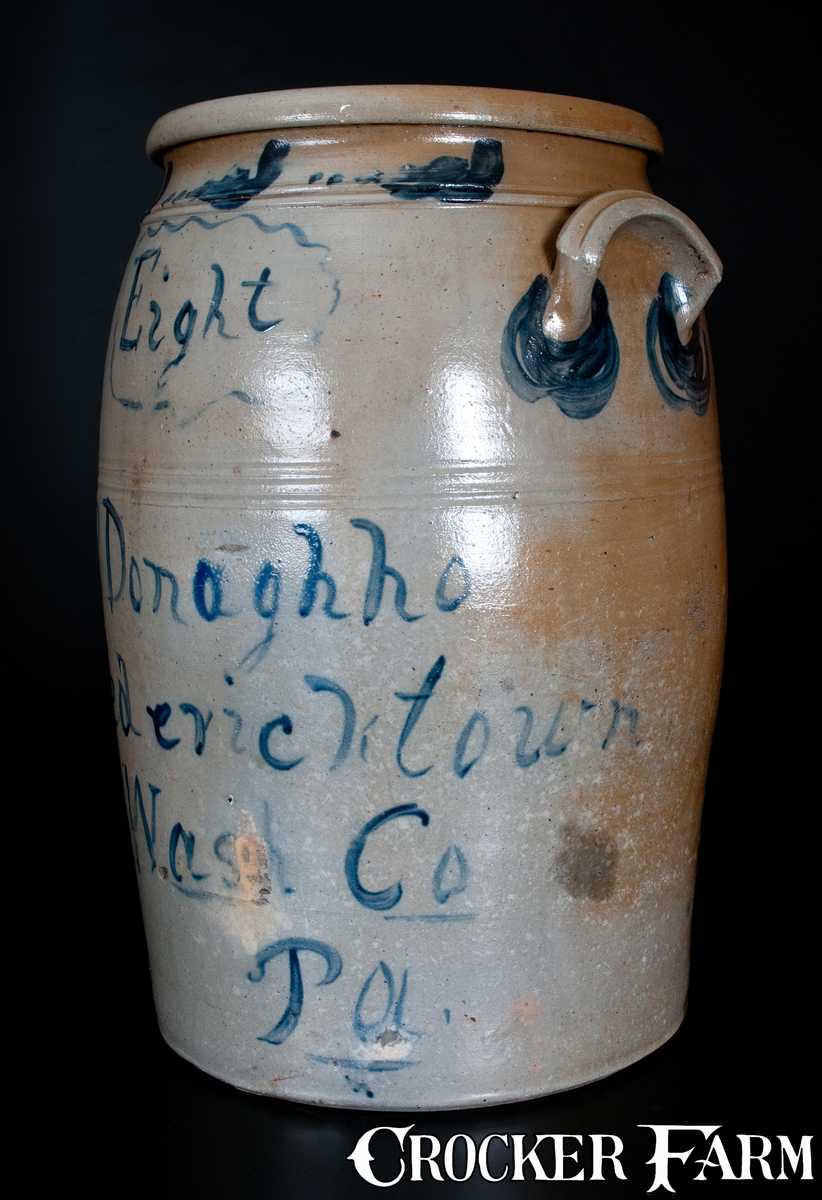 Outstanding and Rare Eight-Gallon Cobalt-Decorated Stoneware Jar with Freehand Inscription "A.P. Donaghho / Fredericktown / Wash Co / Pa.", circa 1865, cylindrical jar with ribbed lug handles, tapered rim, and tooling to body and shoulder, featuring the large brushed cobalt inscription "A.P. Donaghho / Fredericktown / Wash Co / Pa.". Shoulder with inverted swag decoration above the freehand inscription "Eight", surrounded by a wavy line border. Large brushed cobalt highlights to handle terminals. This recently-surfaced jar was produced during Alexander Polk Donaghho's early production years in Fredericktown, Washington County, Pennsylvania. The majority of surviving Donaghho pieces were made later, at his larger operation in Parkersburg, West Virginia, circa 1874-1904. Most significant about the jar is its large freehand signature, as Donaghho's most common method of marking his ware involved the use of a stencil. Its eight-gallon size is exceptional, and its use of a capacity designation with the word "Eight", as opposed to the number "8", is a scarce and appealing feature. This jar ranks as one of the finest examples of Donaghho stoneware we have ever seen. Provenance: A fresh-to-the-market example, consigned from Massachusetts. A large Y-shaped line on underside. A 3" chipped section to interior of rim. Several other small rim chips. H 19".