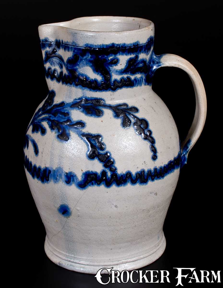 Exceptional One-Gallon Stoneware Pitcher with Profuse Slip-Trailed Cobalt Floral Decoration, Baltimore, MD origin, circa 1820, ovoid pitcher with footed base, tooled collar, and thin strap handle, decorated with a large slip-trailed design of a plant featuring leafy stems culminating in clusters of berries, underscored by a wavy stripe of cobalt. Collar decorated with an undulating vine between two additional wavy cobalt stripes. Brushed circular cobalt highlights to handle terminals. This pitcher exhibits the fine gray clay and dark, artistically-applied cobalt, which made Baltimore the leader in Mid-Atlantic stoneware production for several decades. The cobalt slip on this pitcher is applied in an exceptionally-thick, enamel-like consistency. Provenance: A fresh-to-the-market example, acquired by the consignor's grandfather in the 1950s. Significant cracks in underside, extending several inches up body of pitcher. One of these cracks reaches the rim on the left side of the pitcher. A base chip. A faint spider line to handle, not visible on underside of handle. Some fairly innocuous bubbling to cobalt. H 10 1/2".