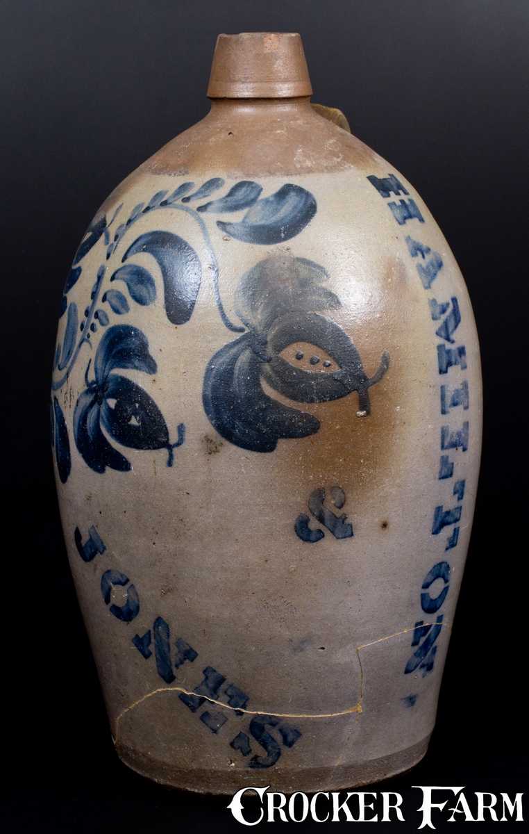 Rare HAMILTON & JONES Stoneware Jug w/ Elaborate Cobalt Floral Decoration and Vertical Stencil