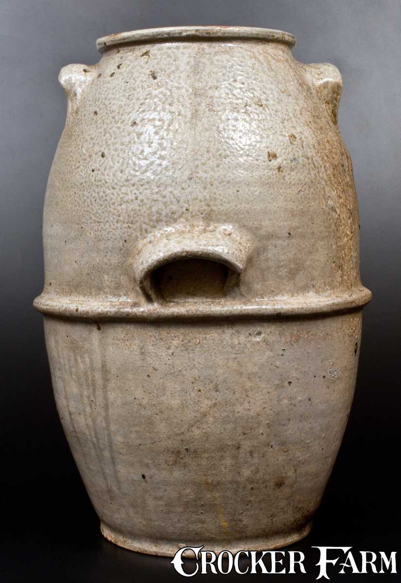 Monumental Four-Handled Salt-Glazed Stoneware Jar with Medial Ridge, attributed to Tinsely W. Craven, Henderson County, TN, circa 1840-1860, large-sized, ovoid jar with semi-squared rim and applied lug handles at the shoulder and midsection, the center of the jar with distinctive raised clay band around its circumference. Surface dipped in a whitish slip and covered in a salt glaze with appealing glaze runs to the shoulder area. A sculptural Tennessee stoneware form, distinctive to the Craven family. Provenance: Recently found in the Midwestern U.S. Cracks to bottom half of jar, one of which continues onto the underside. Minor chipping to base, some of which is glazed over. A few chips to raised band, the longest being a shallow chip measuring 1 1/4". A shallow chip to one handle. A few typical firing flaws. Some flaking to a salt glaze run, which extends from shoulder to the raised band at center. Exfoliation to interior. H 20".