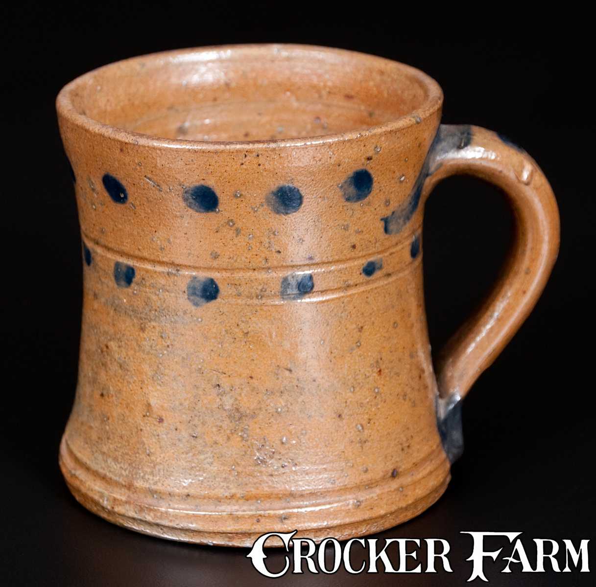 Very Rare Small-Sized Stoneware Mug with Cobalt Spot Decoration, attributed to Charles F. Decker's Keystone Pottery, Chucky Valley, TN origin, circa 1880-1905, finely-potted mug with stepped base, tooled shoulder, and applied handle, decorated around the shoulder with two rows of cobalt spots. Additional spot decoration spanning the length of the handle. Heavy cobalt highlight to lower handle terminal. Upper handle terminal decorated with an inverted U-shaped stroke, reminiscent of the splayed petals of tulips found on much of the Decker family's ware. Comparison of this mug with the designs and forms of a few extremely rare signed examples by William Decker, son of Charles Decker, Sr., indicate this mug may be by his hand. William is the short-statured potter with a neck injury visible on the far left of the iconic Decker Pottery photograph. Excellent, as-made condition with a salt drip to interior. H 3 1/4".