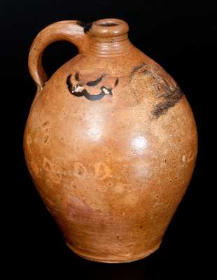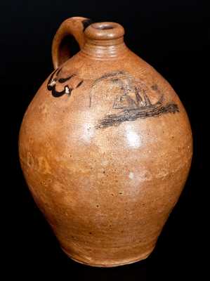 Exceedingly Rare and Important One-Gallon Stoneware Jug with Incised Ship Decoration, attributed to Clarkson Crolius, Sr., Manhattan, NY, circa 1810-1820, ovoid jug with heavily-tooled spout, featuring an incised and cobalt-highlighted design of a three-masted sailing ship sporting two American flags and a banner. Cobalt drape decoration to shoulder on each side. Cobalt highlight to upper handle terminal and along impression at lower handle terminal. The swag decoration, form, and color, are consistent with pieces produced at the shop of Clarkson Crolius, Sr. during the first quarter of the 19th century. More specifically, this jug is closely-related to a small drape-decorated jug, stamped "C. CROLIUS / MANUFACTURER / NEW-YORK", which was sold as lot #32 in our November 6, 2010 auction. The small signed jug shares similarities in color, spout construction, brushed swag decoration, and distinctive lower handle terminal decoration. The jug offered in our March auction is significant in that it is the only example of ship-decorated stoneware we are aware of carrying a strong Crolius family attribution. Professional restoration to much of spout. A faint 2 1/2" hairline on underside of jug, continuing 5" up right side of jug. Some in-the-firing contact marks to surface, typical of pieces of this age and origin. Some light surface wear around midsection. H 10 3/4".