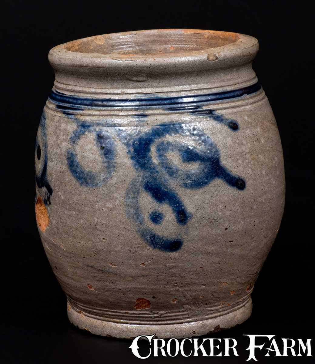 Very Fine Early Quart-Sized Ovoid Stoneware Jar w/ Watchspring Designs, probably Manhattan, 18th century