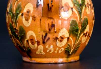 Exceptional and Important Open-Handled Redware Jar with Profuse Three-Color Slip Floral Decoration, Dated Twice 1810, Bucks County, PA origin, 1810, ovoid jar with footed base, squared rim, and ribbed strap handles, lavishly-decorated in yellow, green, and brown slip on the front and reverse with two flowering plants bearing three differently-styled blossoms. Handles decorated with brown-slip foliate designs. Inscribed with the early slip-trailed date "1810" in green slip under one handle, and the date "1810" in yellow slip under opposite handle. An elegantly-potted example brimming with Pennsylvania-German tulips and daisies, this consignment is arguably one of the most extravagant American slip-decorated redware jars known. A study of the extensive Pennsylvania redware collections at Winterthur and the Philadelphia Museum of Art can find few jars with slipwork comparable in abundance and artistry. One of the most important examples of Pennsylvania redware to come to auction in recent years. Glazed body of jar survives in remarkable, essentially as-made condition with minimal wear. Shallow chipping along one edge of each handle. An additional handle chip and other very minor wear to handles. Wear to rim. Provenance: A fresh-to-the-market example, purchased by the consignor in the early 1990s. H 5 7/8".