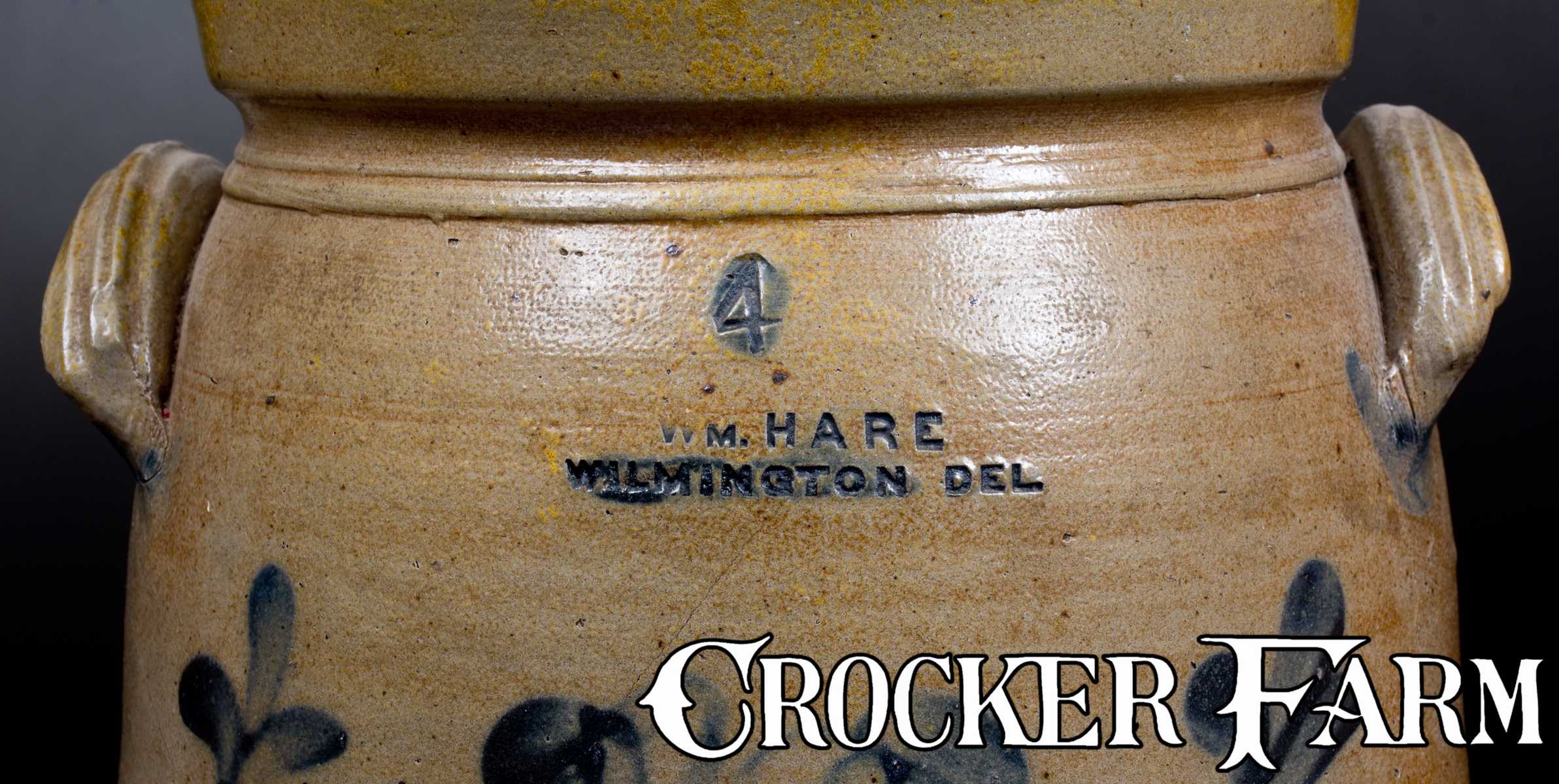 Extremely Rare Four-Gallon Stoneware Jar with Cobalt Floral Decoration, Stamped "WM. HARE / WILMINGTON, DEL", Delaware origin, circa 1875, cylindrical jar with tooled shoulder, semi-squared rim, and ribbed lug handles, decorated on the front with a two-stemmed floral motif flanked by leaves. Reverse with wavy cobalt stripes flanking a second two-stemmed floral motif. Cobalt highlights to maker's mark, capacity mark, and handle terminals. The Delaware potter, William Hare, is well-known for his small, undecorated stoneware canning jars, as numerous signed examples have survived. However, while prolific in the production of this specific type of jar, all other forms bearing his mark are considered rare. Even more unusual are cobalt-decorated examples, of which only a small number have been documented. This jar, potted in a highly unusual four-gallon size, features extremely rare cobalt brushwork on two sides. Both its form and decoration are strongly-influenced by styles from nearby Philadelphia and Baltimore. It is the first decorated example of Hare stoneware we have ever offered. Provenance: A fresh-to-the-market example, purchased by the consignor decades ago. Large spider crack on front. A 1" chip to one handle. A thin 1" crack to bottom edge of opposite handle. Small chips to interior of rim. A few small, minor chips to interior of rim and two tiny nicks to exterior of rim. H 16".