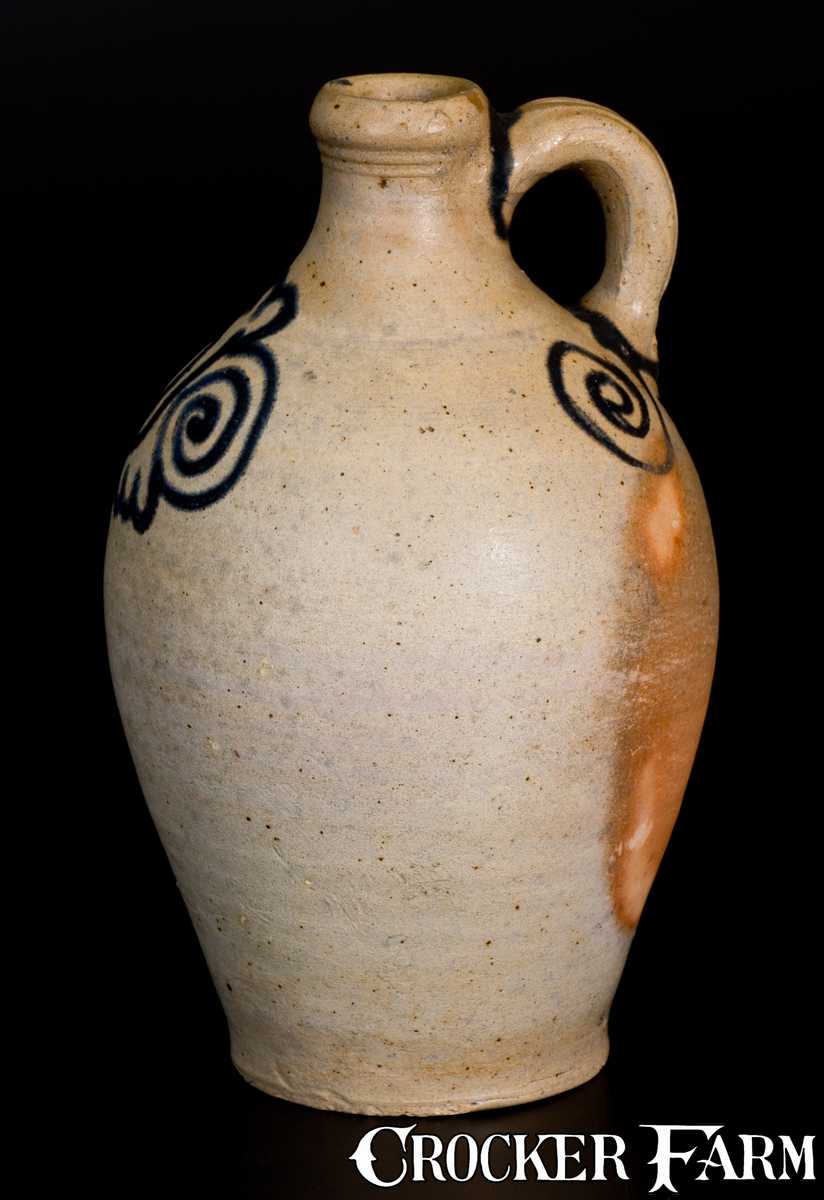 Very Fine Quart-Sized Stoneware Jug with Cobalt Watchspring Decoration, Manhattan, NY or Cheesequake, NJ origin, circa 1750-1780, ovoid jug with tooled spout and heavily-ribbed handle, decorated on the front with a thickly-slip-trailed "watchspring" motif including scalloped embellishments above and below. Slip-trailed watchspring decoration emanating from the base of the handle. Cobalt highlights to handle terminals. The color of this jug indicates a possibly Manhattan, NY origin. The form of the spout, which includes a long slender neck and tooling near the top, indicates this jug was made earlier than many of the surviving watchspring-decorated pieces known. This spout construction can be observed on the iconic "I. Havens" presentation jug, attributed to John Crolius, which bears the incised date, "1775. July 18.", and initials, "I.C.", and is currently on display at the Metropolitan Museum of Art in Manhattan. The size, color, and condition of this example are noteworthy. Provenance: A fresh-to-the-market example, purchased by the consignor decades ago. Base chips. A minor spout chip on reverse. Minor wear to lower handle terminal. H 9".