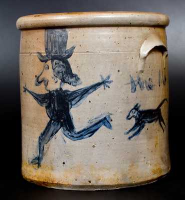 Outstanding Five-Gallon Stoneware Crock with Cobalt Decoration of a Dog Chasing a Man, Ohio origin, circa 1860, large-sized, cylindrical crock with tooled shoulder, rounded rim, and applied lug handles, decorated with a folky brushed design of a running man with top hat, long hair, and raised arms, chased by a dog. Reverse decorated twice with a freehand number "5" flanked by three clusters of grapes. Underside with brushed inscription, "the 14". Wonderful subject matter with a playful charm about it, imbued with a strong sense of motion. The quality of this extremely rare design is enhanced by its size, as the central human figure measures an impressive 10 1/2" tall by 8" wide. Provenance: A fresh-to-the-market example, consigned from the Southern U.S. A tight Y-shaped crack across underside, continuing onto base area on reverse. Two chips to each handle. Some in-the-firing chipping to bottom edge. H 13 1/8".