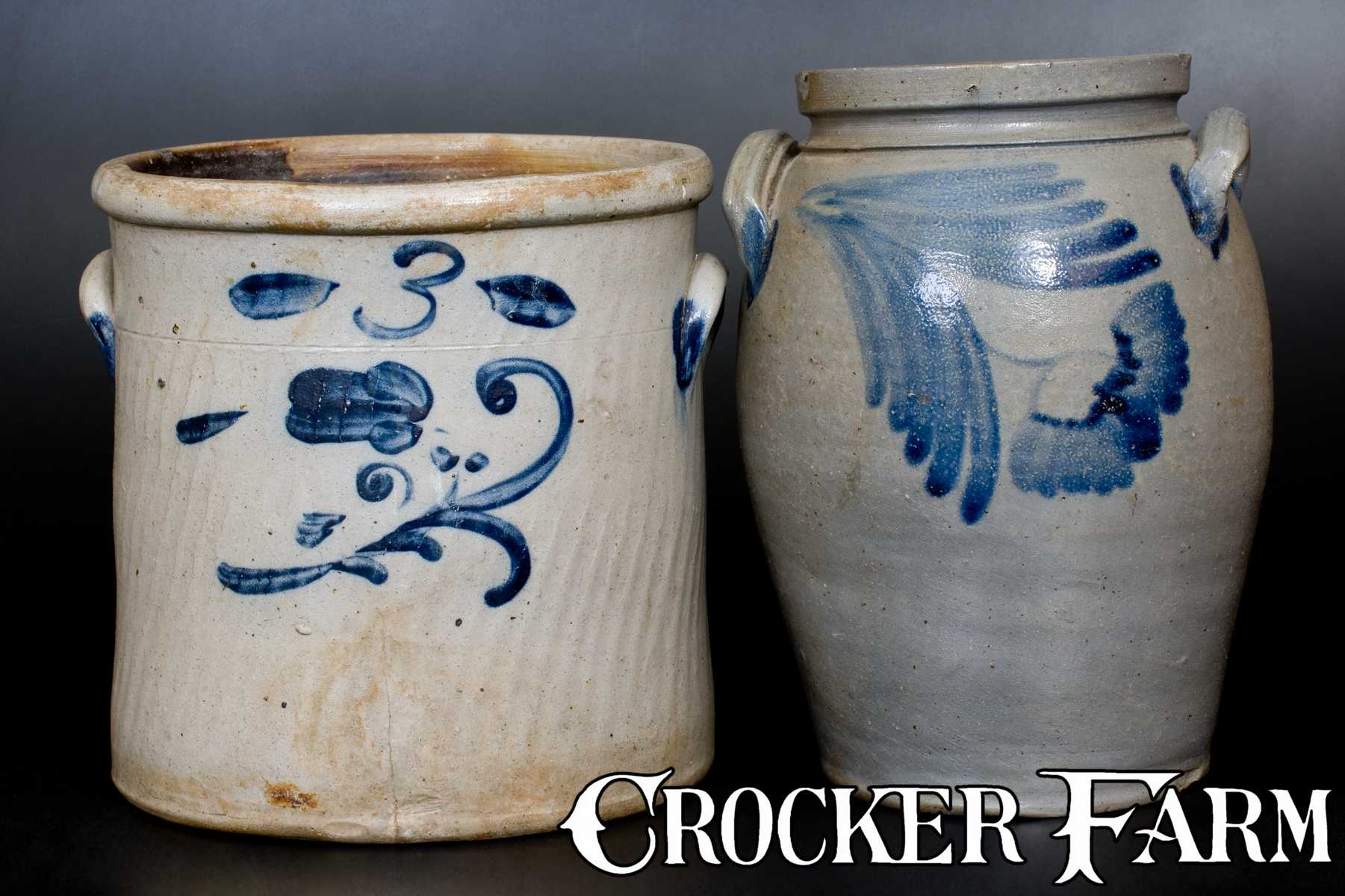 Lot of Two: Stoneware Jars with Cobalt Floral Decoration
