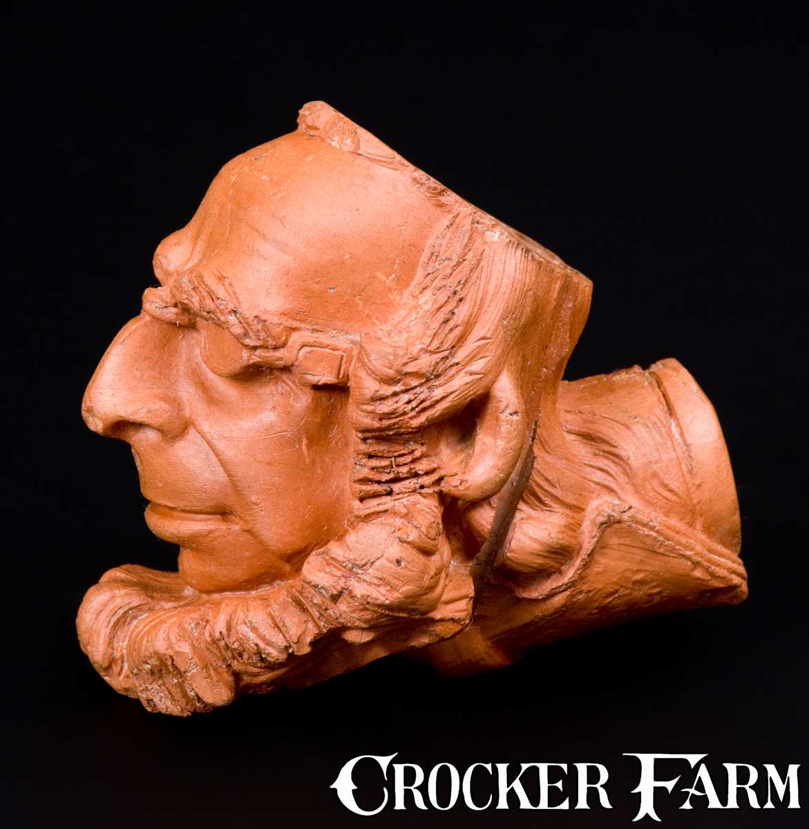 Rare Terracotta Pipe Bowl Depicting Peter Cooper, August Peyrau, New York, NY, circa 1883, finely-modeled in the likeness of American philanthropist, industrialist, and presidential candidate, Peter Cooper (1791-1883). Cooper, a New York City native, was known for developing the first American steam locomotive, the Tom Thumb. Pipe bowl includes incised details to facial hair and eyebrows. Impressed "5" along with a number of other illegible marks on underside. Literature: Peyrau's caricature pipes are discussed and illustrated in Barber, Edwin Atlee, The Pottery and Porcelain of the United States, G.P. Putnam Son's, New York and London, 1893, p. 341, and are present in the collection of the Brooklyn Museum and--at least at one time--the Philadelphia Museum of Art. Peyrau was seen in his day as a visionary, with one contemporary writing, "August Peyrau ... has ... reproduced in red clay or terra cotta caricature heads of [famous people, etc.]. For a time they were on sale in New York City, but more recently they have disappeared from show windows of the tobacconists, and with them their interesting maker. Peyrau was a Frenchman who gave up a prosperous business to return to his native village in the South of France, but on arriving there he found a new generation in existence and his old friends gone. After a few months he wearied of the place, and then came back to his adopted country. Times were hard and it was not easy to start in business again. So he supported himself for a time by modeling his caricature pipe heads, and now he has disappeared again. In the years to come when his pipes will sell for dollars instead of cents, who will remember their maker?" We are unaware of any examples of Peyrau's work coming to auction over the last many years. Loss to opening, which connects to stem. A 1/2" rim chip. L 2 1/2".