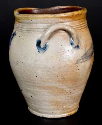 Rare and Important Two-Gallon Stoneware Jar with Incised Bird Decoration, attributed to Paul Cushman, Albany, NY, early 19th century, ovoid jar with footed base, heavily-tooled shoulder, and applied lug handles, decorated on the front and reverse with an incised and cobalt-highlighted design of a ring-necked bird with long tail. One side includes incised dots in front of the bird's bill, representing berries or seeds on which the bird is feeding. Brushed cobalt highlights to handle terminals. This jar is consistent in form and handle construction to pieces produced in Albany, New York during the first decade of the 19th century, most notably those made at the shop of pottery owner, Paul Cushman. The pot and its incised designs were likely crafted by potters, Jonah or Calvin Boynton. Few examples of Albany, NY stoneware are known featuring an incised bird on both sides. Provenance: A fresh-to-the-market example, from a fifty-year private collection. Heavy chipping to base. A wide, in-the-firing clay separation on interior, visible as a recessed area with faint vertical line on exterior. A 4 1/2" vertical surface line below one bird's tail. H 12".