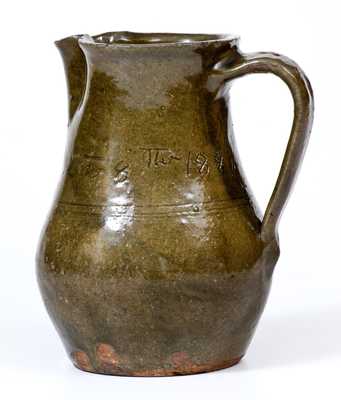 Extremely Rare Alkaline-Glazed Stoneware Pitcher, Signed and Dated "John Terry / April the 8th / 1887", Bibb County, AL origin, 1887, small-sized pitcher with ovoid belly, tooled midsection, tall collar, and thin strap handle, the surface covered in a green alkaline glaze. Incised in script across the collar, "John Terry / April Th 8Th 1887". A fine example of signed Alabama stoneware, exhibiting excellent form. Provenance: Dr. Raymond L. Owen, MD. Literature: The potter, John H. Terry, is listed in Brackner, Alabama Folk Pottery, University of Alabama Press, 2006, p. 254. Brackner's research states that Terry was born in South Carolina in 1810. This detail offers the possibility that he learned to pot in Edgefield. He is listed in the 1850 Bibb County, AL census as a potter and in the 1860 census as a farmer. He married Elizabeth Emily Baker in 1833 in St. Clair County, and had children born in Alabama between 1833-1858 (Brackner, p. 254). Very nice condition with some shallow chipping to spout and minor rim chips. H 7".