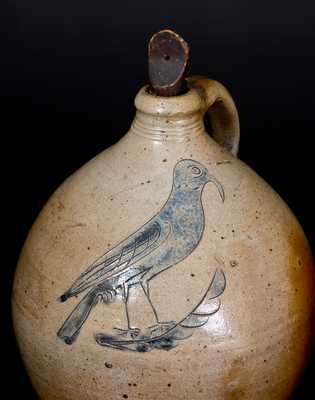 Outstanding and Rare Two-Gallon Stoneware Jug with Large Incised Bird Decoration, Manhattan, NY origin, possibly Crolius Family, early 19th century, ovoid jug with heavily-tooled spout, decorated with an incised and cobalt-highlighted design of a ring-necked bird perched on a stylized branch. Brushed cobalt highlights to handle terminals. The form of the jug indicates a Manhattan, NY origin, as does the overall style of the bird, which is related to several other songbird and pheasant motifs most likely made by the Crolius family of Manhattan, NY. While the Manhattan origin of this jug is undeniable, the artist of its incised design indicates a different, arguably folkier, hand than all other Crolius-type birds we have seen, as shown in the shorter tail, highly-unusual, cross-hatched wing, differently-styled feet and branch, and long bill. Bird designs from Manhattan are relatively rare. This example survives in exemplary condition with a design that measures an impressive 7" long from bill to tail. Includes old wooden stopper. Provenance: A fresh-to-the-market example, from a fifty-year private collection. Excellent condition with a few base chips and some light staining. H 14 1/2".