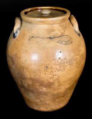 Extremely Rare Three-Gallon Lidded Stoneware Jar with Incised Bird Decoration, Stamped "R. SEYMOUR / TROY", New York State origin, circa 1830, ovoid jar with tooled shoulder, flared collar, and applied lug handles, decorated with an incised and cobalt-highlighted design of a bird perched on a stylized leaf, flanked by two brushed tulip motifs. Reverse with lightly-brushed cobalt looping line flourish with cross-hatched interior. Brushed cobalt highlights to maker's mark and handle terminals. This jar is the first piece we have offered bearing the maker's mark, "R. SEYMOUR / TROY", which may have been modified from an Israel Seymour stamp, as the letter R is raised higher than the word "SEYMOUR". This jar's inclusion of freehand floral decoration flanking the bird is additionally an unusual treatment. Includes loosely-fitting, salt-glazed stoneware lid, possibly a later association with the jar. Provenance: Property of a New York State collector. Literature: Discussed in Broderick and Bouck. Pottery Works: Potteries of New York State's Capital District and Upper Hudson Region. London and Toronto. Associate University Presses, 1995, p. 138. Exfoliation to midsection on reverse. Small chips and wear to interior of rim. Minor chips to exterior of rim. Some staining. Lid in excellent condition.