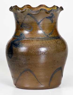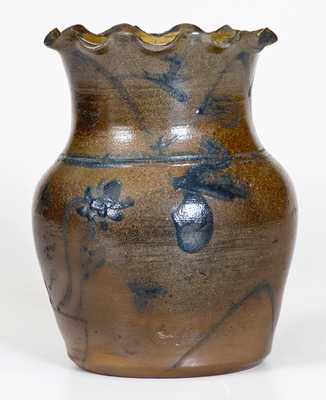Outstanding Stoneware Vase with Cobalt Flowering Urn Decoration, WV origin, circa 1865-1885, ovoid vase with tall collar and crimped rim, decorated on the body with a brushed design of a flowering plant emanating from a stylized urn. Additional decoration around the body of an undulating vine bearing a blossom with splayed petals, along with an additional flower blossom to right of urn. Flowering vine decoration to collar and cobalt stripe at base of collar. Interior with Albany slip glaze. The flowers on this vase are loosely-related to a floral design found on a Nathaniel Clark, Parkersburg, WV jar sold in Crocker Farm, Inc.'s November 6, 2010 auction. The exterior clay body as well as the smooth unglazed gray clay underside are highly reminiscent of stoneware made at the A.P. Donaghho pottery of Parkersburg, WV, during the fourth quarter of the 19th century. While atypical of Donaghho's work in form and decoration, we believe this vase was likely made at his site or at another nearby pottery. Exceptional, artistic form. Provenance: A fresh-to-the-market example, recently found in Virginia. Chips to crimping. Otherwise excellent condition. H 6".