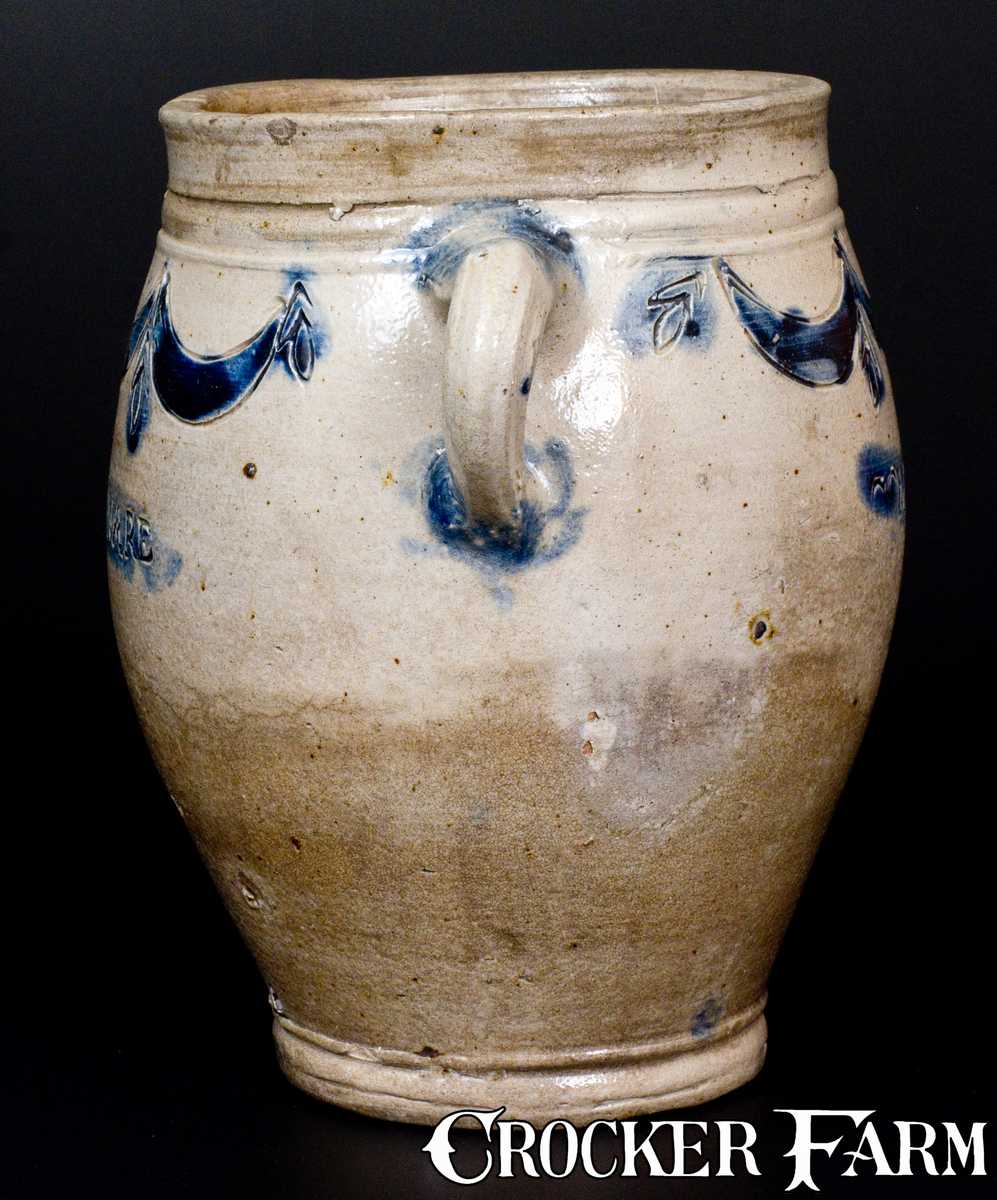 Rare One-Gallon Vertical-Handled Stoneware Jar with Impressed Swag-and-Tassel Decoration, Stamped "COMMERAWS STONEWARE", Thomas Commeraw, Manhattan, NY, circa 1800, ovoid jar with footed base, heavily-tooled shoulder, and open vertical handles, decorated on the front and reverse with an impressed and cobalt-highlighted drape-and-tassel motif. Impressed on the front with maker's name, "COMMERAW.S", and on the reverse with the word, "STONEWARE", both highlighted in cobalt slip. Brushed cobalt highlights to handle terminals. Desirable form with excellent color. Provenance: A fresh-to-the-market example from a fifty-year private collection. A 1 3/4" thin Y-shaped crack on underside, forming a 3 3/8" Y-shaped line on side of jar. Some exfoliation to surface, most or all of which occurred in the firing. A 2" inverted Y-shaped line from rim on reverse. A hairline through one handle. Small rim chips. Two small base chips and a small chip to raised tooling near base. H 9 1/2".