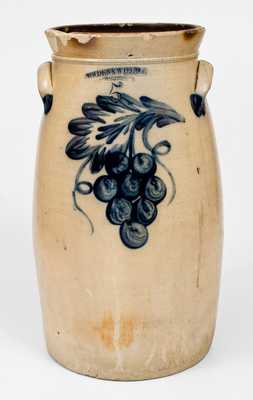 Rare Five-Gallon Stoneware Churn with Bold Cobalt Grapes Decoration, Stamped "COWDEN & WILCOX / HARRISBURG, PA", circa 1865, large-sized, semi-ovoid churn with applied lug handles and flared collar, the front decorated with a large cluster of eight grapes hanging from a leaved stem, flanked by two corkscrewing vines. Cobalt highlights to maker's mark, capacity mark, and handle terminals. Excellent form, size, decoration, and color. The churn form is considered one of the rarest produced by this well-known Central Pennsylvania firm. Provenance: A fresh-to-the-market example, purchased by the consignor approximately forty years ago. Heavy chipping to rim. Wear to inner rim, which would hold a lid. A thin 4" crack from rim on front, a thin 2" crack from rim above one handle, and a thin 4" crack from rim on reverse. Some in-the-firing vertical streaks to salt glaze around base area of churn. A base chip. A small salt drip on reverse. Some thin streaks of discoloration. H 18".
