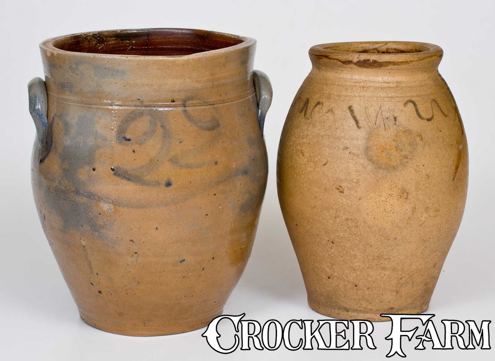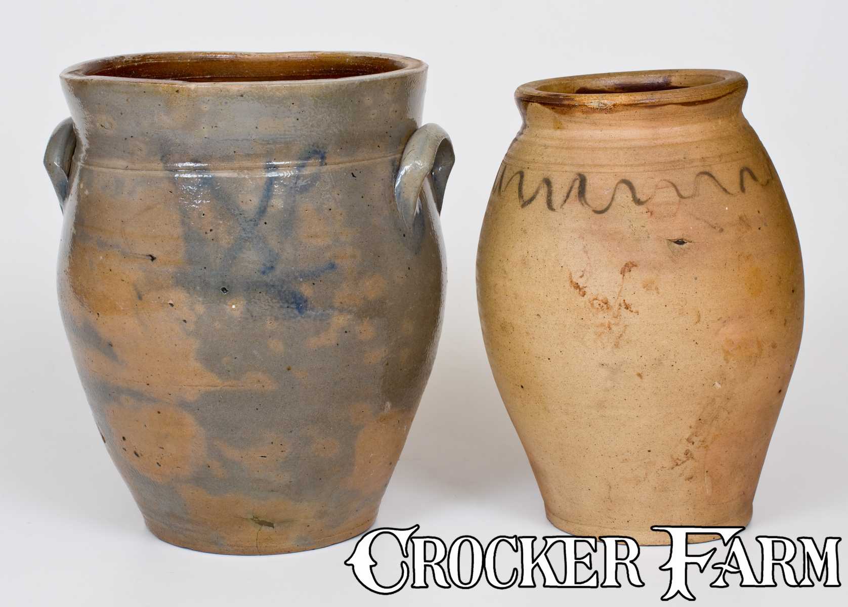 Two Cobalt-Decorated Stoneware Jars, Northeastern U.S. origin, first quarter 19th century, an ovoid jar with slip-trailed cobalt wavy line design, Manhattan, NY origin, early 19th century; paired with a two-gallon jar with a brushed "22" on front and a stylized cobalt insignia on the reverse, possibly Xerxes Price, Sayreville, NJ or New York State origin, circa 1820. Manhattan jar with base chips and a few small in-the-firing flaws to surface. Two-gallon jar with a glue-filled stone ping at base with glazed-over cross-shaped line extending through it, connecting to crazing throughout underside. This crazing is not visible on the interior. An additional 4 1/4" glazed-over cross-shaped surface line near one handle, which is not visible on interior. A few rim chips and short in-the-firing lines from rim. An in-the-firing 2" separation line on interior of rim, not visible on exterior.