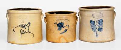 Three Brown Brothers, Huntington, Long Island Stoneware Crock s with Cobalt Decoration, New York State origin, circa 1863-1905, all of cylindrical form with various brushed or slip-trailed floral or foliate motifs; a one-gallon example, stamped "BROWN BROS / HUNTINGTON. L.I"; a one-and-a-half-gallon example, stamped "BROWN BROTHER , / HUNTINGTON, / L.I."; and a one-and-a-half-gallon example, stamped "BROWN BROTHERS, / HUNTINGTON, / L.I.". Provenance: Donald Matties Collection. One-gallon crock with a thin 3" crack from rim, a hairline to underside, rim chips, two iron pings to interior, and some exfoliation to the Albany slip on the interior base. One-and-a-half-gallon crock with slip-trailed design has a large area of restoration to reverse and underside and some light exfoliation to front. Other one-and-a-half-gallon crock with significant restoration, some of which touches the cobalt.
