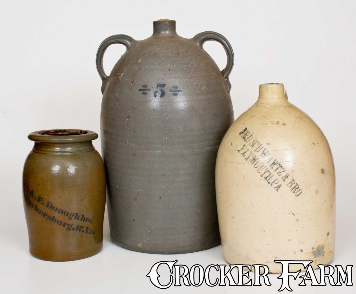 Lot of Three: A. P. DONAGHHO Jar, Donaghho Double-Handled Jug, PLYMOUTH, PA Jug