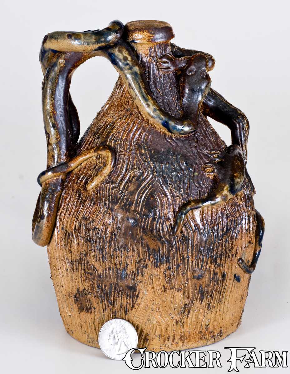 Extremely Rare Cobalt-and-Albany-Slip-Decorated Stoneware Temperance Jug with Applied Snake, Lizard, and Monkey Decorations, attributed to Simeon L. Bray, Evansville, Indiana, circa 1885, ovoid jug with tapered spout and combed, bark-like incising throughout, the handle in the form of a hand-modeled snake biting the arm of an applied figure of a monkey, whose head disappears into the neck of the jug. A second snake applied atop the handle bites the monkey's second arm. Two smaller snakes and a lizard are applied to the body of the jug, pursuing the monkey. Surface covered in a salt glaze with heavy cobalt highlights to the snakes and lizard, iron-oxide highlights throughout the jug's surface and animals, additionally overglazed with daubs of chocolate-brown Albany slip. Simeon, along with his brothers, J. Wallace and William, spent their early years in the town of Anna, Illinois, where they likely learned the pottery trade from the famed Kirkpatrick brothers. This work is one of a small number of Anna-inspired Bray family temperance jugs known. It is noteworthy in its size, believed to the largest-capacity Bray example known, and most importantly in its glaze, being the only documented example with cobalt decoration. This jug survives in rarely-found excellent, essentially as-made condition. Temperance jugs, because of their delicate applied work, typically succumbed to losses in the firing or from use. H 7 3/4".